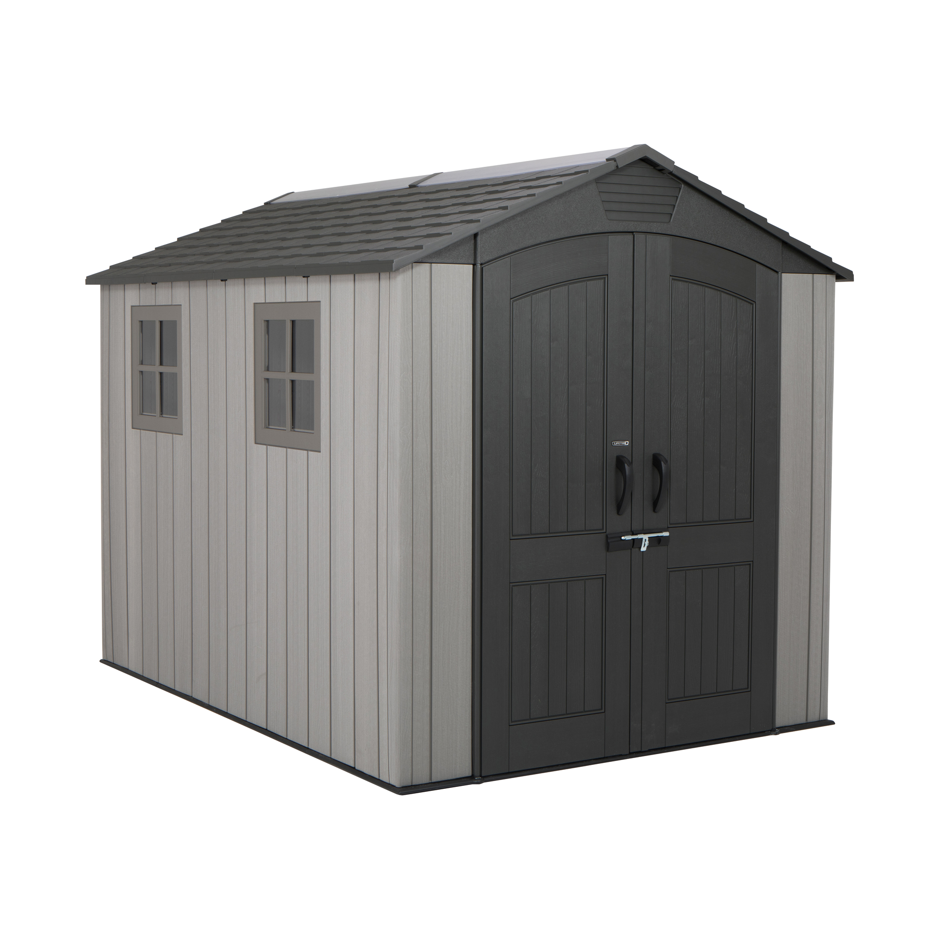 Gerätehaus Das stabilste Kunststoffgerätehaus auf dem Markt! Die hochqualitativen Gerätehäuser von Lifetime gelten als die stabilsten und langlebigsten Kunststoff-Gerätehäuser auf dem Markt — und das nicht ohne Grund: Seine enorme Stabilität erhält das Gerätehaus durch die Konstruktion aus doppelwandigem, metallverstärktem HDPE-Kunststoff (Hart-Polyethylen). Die Dachkonstruktion aus Hochleistungsstahl hält einer Traglast von bis zu 195 kg/m² Stand und die ideale Dachneigung von 23% ermöglicht zudem ein schnelles Ablaufen von Wasser und Schnee. Die robusten Lifetime-Gerätehäuser sind für den ganzjährigen Outdoor-Betrieb konstruiert und absolut wetterfest und UV-beständig. Die große Doppeltür ermöglicht einen einfachen Zugang und unkompliziertes Verstauen Ihrer Gerätschaften. Dank der rauen Wandoberfläche in Dunkelgrau („Rough-Cut“) wird das Gerätehaus nicht nur zum praktischen Unterstand für Ihre Geräte und Gartenutensilien, sondern gleichzeitig auch zu einem wahren Hingucker in Ihrem Garten. Auch um die Wartung des Gerätehauses müssen Sie sich keine Gedanken machen: Der hochwertige Kunststoff ist äußerst pflegeleicht und wartungsfrei. – Breite: 204, – Gewicht: 193, – Höhe: 227, – Länge: 285, – Material: Kunststoff