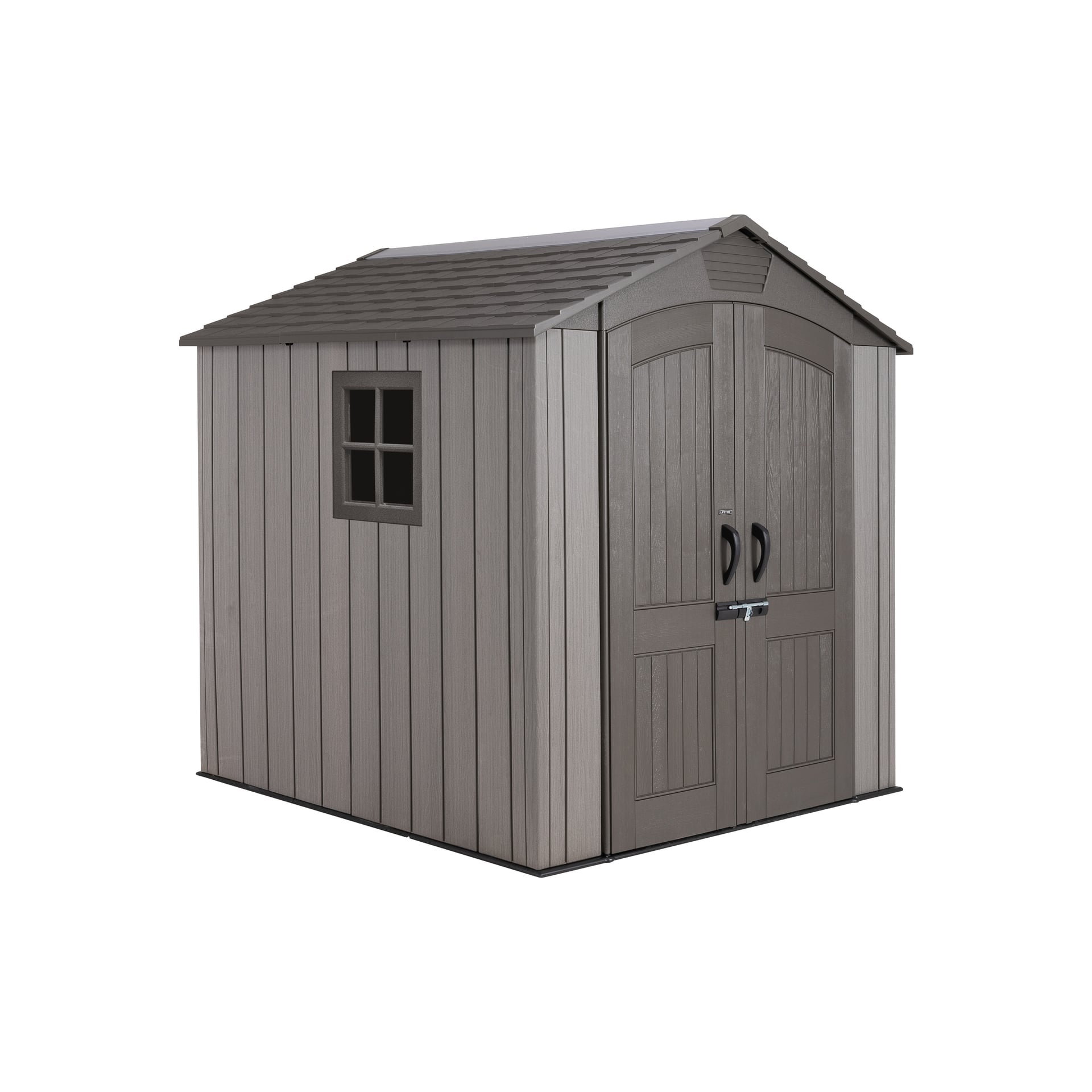 Gerätehaus Das stabilste Kunststoffgerätehaus auf dem Markt! Die hochqualitativen Gerätehäuser von Lifetime gelten als die stabilsten und langlebigsten Kunststoff-Gerätehäuser auf dem Markt — und das nicht ohne Grund: Seine enorme Stabilität erhält das Gerätehaus durch die Konstruktion aus doppelwandigem, metallverstärktem HDPE-Kunststoff (Hart-Polyethylen). Die Dachkonstruktion aus Hochleistungsstahl hält einer Traglast von bis zu 195 kg/m² Stand und die ideale Dachneigung von 23% ermöglicht zudem ein schnelles Ablaufen von Wasser und Schnee. Die robusten Lifetime-Gerätehäuser sind für den ganzjährigen Outdoor-Betrieb konstruiert und absolut wetterfest und UV-beständig. Die große Doppeltür ermöglicht einen einfachen Zugang und unkompliziertes Verstauen Ihrer Gerätschaften. Dank der rauen Wandoberfläche in Dunkelgrau („Rough-Cut“) wird das Gerätehaus nicht nur zum praktischen Unterstand für Ihre Geräte und Gartenutensilien, sondern gleichzeitig auch zu einem wahren Hingucker in Ihrem Garten. Auch um die Wartung des Gerätehauses müssen Sie sich keine Gedanken machen: Der hochwertige Kunststoff ist äußerst pflegeleicht und wartungsfrei. – Breite: 204, – Gewicht: 174, – Höhe: 227, – Länge: 204, – Material: Kunststoff