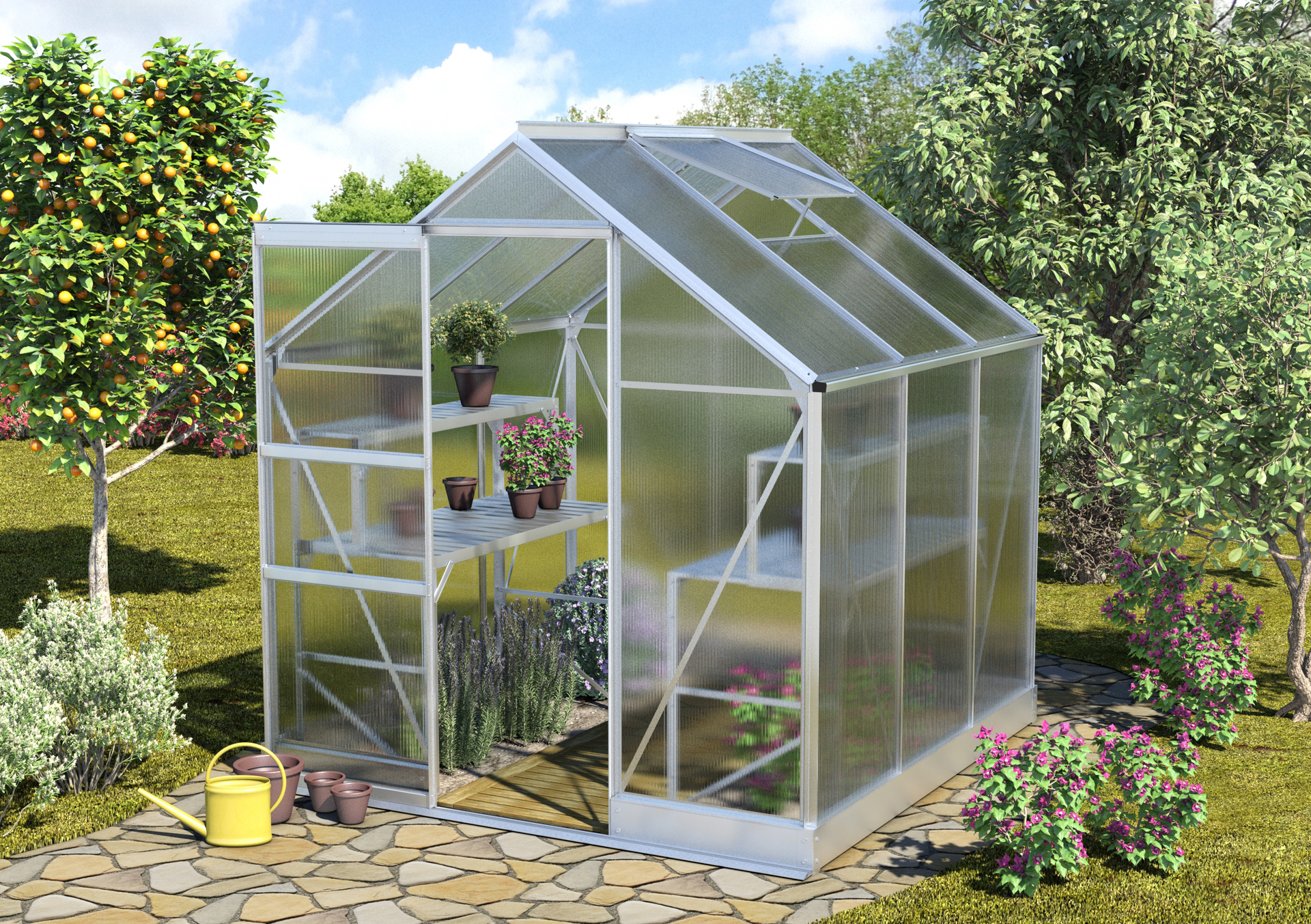 Mit Grundflächen von 2,5 bis 6,2 m², filigranen Aluminiumprofilen und der Licht streuenden und für die Pflanzen sicheren HKP-Eindeckung ebnet unser Apollo den Weg ins Neuland Gewächshausgärtnern: Einsteiger wählen aus den vier verschiedenen Größen die Anbaufläche, die sie meistern können, verlassen sich auf den Schutz ihrer Pflanzen vor zu intensiver Sonne und starten dank der umfangreichen Serienausstattung – z.B. Stahlfundamentrahmen, Dachfenster für die Be- und Entlüftung sowie Regenrinnen zum Sammeln von Regenwasser – ohne Stolperfallen in die Gartensaison. Und das nicht nur im übertragenen Sinne: Die bodentiefe Türschwelle erlaubt den barrierefreien Zugang durch die 1,74 m hohe und 0,61 m breite Tür und verhindert so ein Stolpern, auch wenn der Sack Blumenerde auf dem Arm einmal die Sicht nach unten versperrt. Ob in Aluminium eloxiert oder Schwarz (pulverbeschichtet): Dank ihrer Oberflächenbehandlung sind die Profile optimal gegen Korrosion und Verwitterung geschützt.