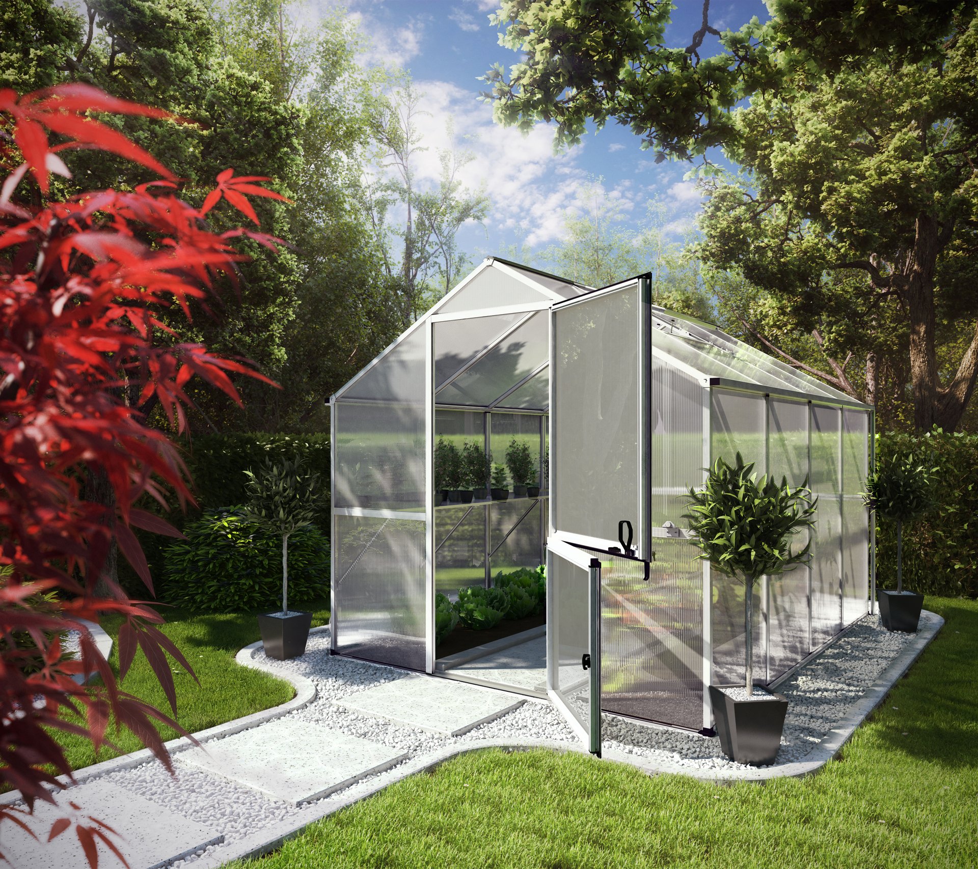 Gewächshaus Callas Das KGT Gewächshaus Callas IV (Farbe: Aluminium pressblank), mit den Maßen 2,27 x 3,00 m, ist das perfekte Einsteigermodell in die Gewächshauswelt. Neben der breiten, abschließbaren, geteilten Drehtür verfügt das Gewächshaus zusätzlich über ein Dachfenster mit automatischem Fensterheber, damit eine optimale Be- und Entlüftung Ihrer Pflanzen gewährleistet wird. Durch die Stehwandhöhe von 1,49 m und einer großzügigen Firsthöhe von 2,14 m ist jede Menge Raum zum Gärtnern vorhanden. So können auch Tomaten und Gurken problemlos in die Höhe wachsen und sich vollends entfalten. Die stabile Aluminium-Konstruktion sowie die transparenten, wärmeisolierenden 6 mm-starken ISO-Hohlkammerplatten aus hochbruchfestem Polycarbonat sorgen für beste Stabilität. Beidseitige Regenrinnen mit Abläufen sind ebenso vorhanden. Das Haus eignet sich ideal zur Aufzucht von Pflanzen im zeitigen Frühjahr. – Farbe: pressblank, – Breite: 2,27, – Dach: Satteldach, – Fenster: 1,0, – Firsthöhe: 2140mm, – Fläche: 6,81m², – Länge: 3, – Material: Aluminium, – Türart: Geteilte Drehtür (abschließbar), – Produktart: Gewächshaus, – Höhe: 2,14 1 Gewächshaus
