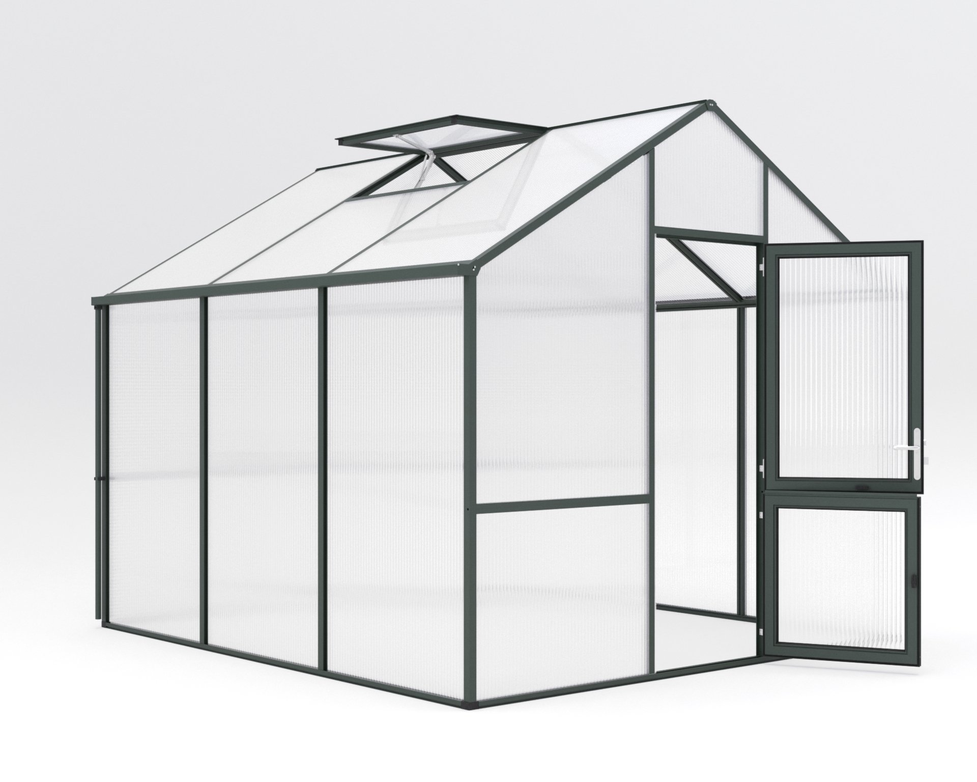 – Breite: 2,97, – Gewicht: 210, – Höhe: 2,76, – Länge: 3,23, – Material: Aluminium, – Produktart: Gewächshaus