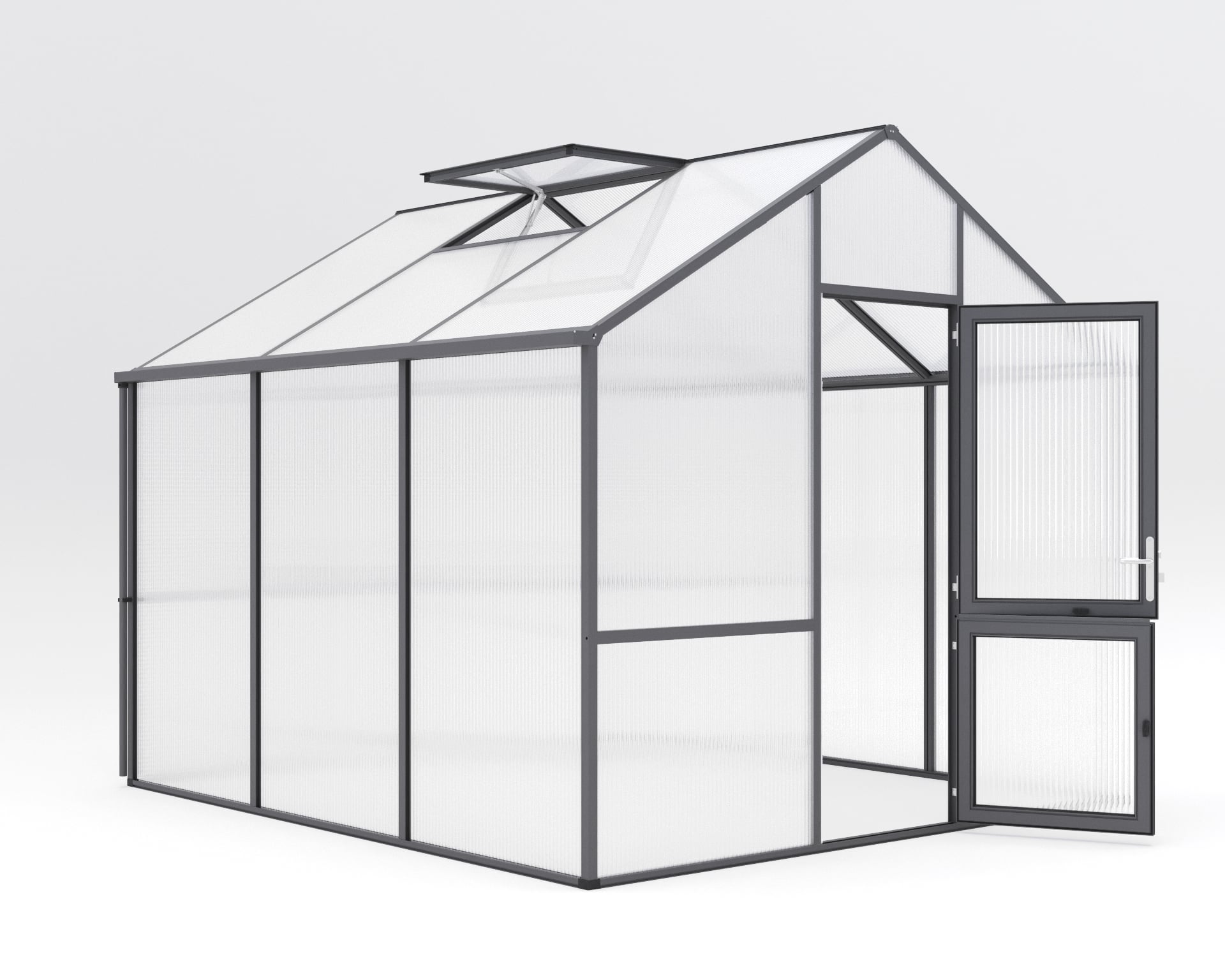 Gewächshaus Dahlie Sorgfältig gestaltet für leidenschaftliche Hobbygärtner – Das Gewächshaus Dahlie. Hier sind Innovation und Eleganz vereint, um die ultimative Umgebung für Ihre Pflanzen zu schaffen. Die Aluminiumkonstruktion vom Dahlie steht für außergewöhnliche Stabilität und Langlebigkeit. Durch die bewusste Entscheidung gegen Klammern und Kunststoffleisten wird nicht nur das ansprechende Erscheinungsbild bewahrt, sondern auch die Stabilität erhöht. Die raffinierte Belüftung von Dahlie wurde mit Effizienz im Sinn konzipiert. Die großzügige, geteilte Drehtür ermöglicht einen einfachen Zugang, während das geräumige Dachfenster mit automatischem Fensterheber für optimale Luftzirkulation sorgt. Ein rückseitiges Fenster mit Handaufsteller rundet das ausgeklügelte Belüftungssystem ab. Das Dahlie ist mit einer großzügigen Stehwandhöhe von 1,90 m ausgestattet, die ein komfortables Arbeiten in aufrechter Position ermöglicht. Vom Samen bis zur Ernte – Das Dahlie wird zu Ihrem verlässlichen Partner in jeder Wachstumsphase. Die 16 mm ISO-Hohlkammerplatten vom Dahlie sorgen für eine hervorragende Isolierung und schaffen optimale Bedingungen für das Pflanzenwachstum. Passen Sie Ihr Dahlie nach Ihrem Geschmack an. Wählen Sie zwischen den Farben “pressblank”, “tannengrün (RAL 6009)” und “anthrazit-grau (DB 703)” und verleihen Sie Ihrem Gewächshaus eine persönliche Note. Dahlie – Ihr privater Gartenraum mit unvergleichlicher Stehwandhöhe. Treten Sie ein und erleben Sie die Freude des Gärtnerns auf einem unerreichten Niveau. – Breite: 2,97, – Gewicht: 210, – Höhe: 2,76, – Länge: 3,23, – Material: Aluminium, – Produktart: Gewächshaus 1 Gewächshaus