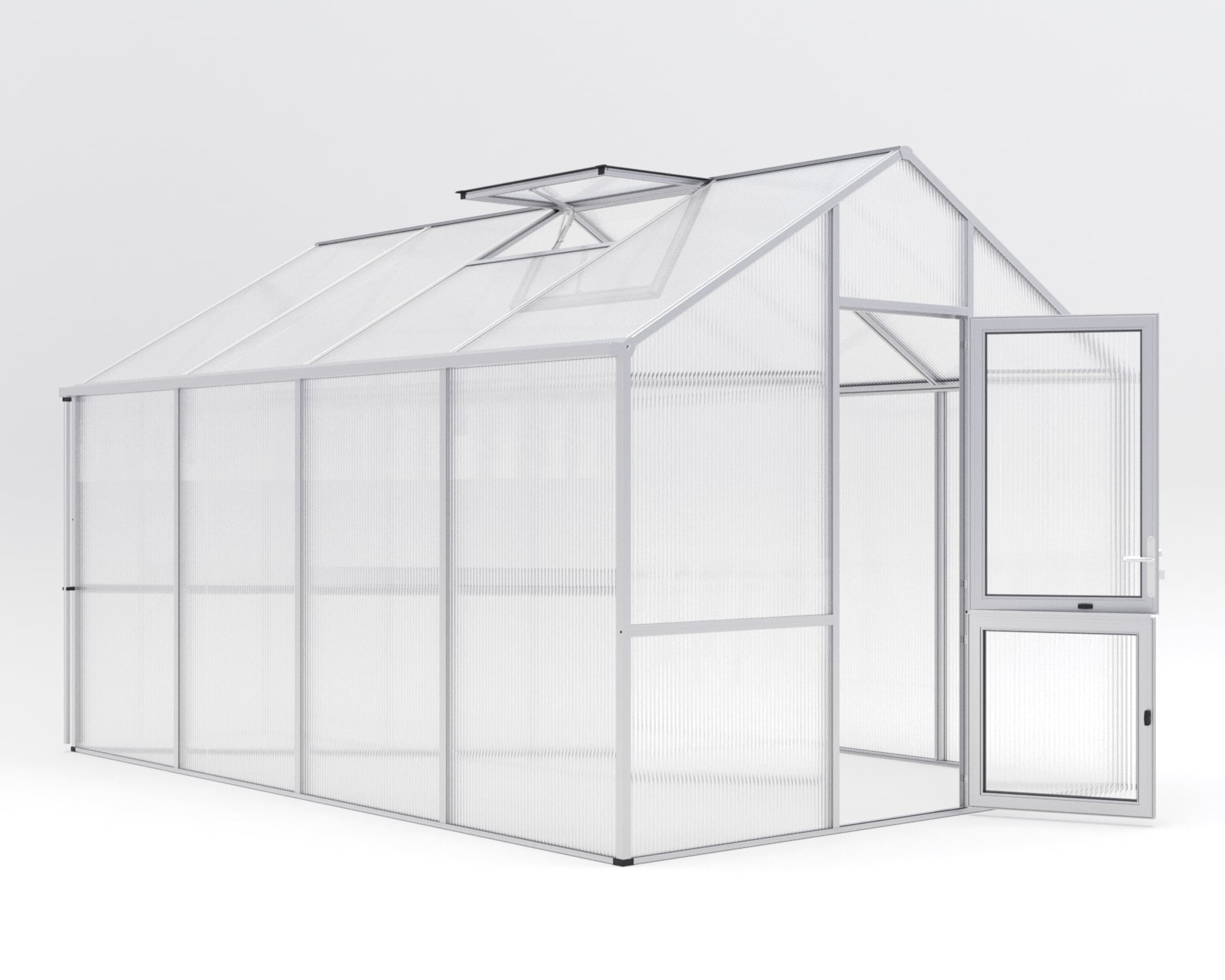 – Breite: 2,97, – Gewicht: 250, – Höhe: 2,76, – Länge: 4,29, – Material: Aluminium, – Produktart: Gewächshaus