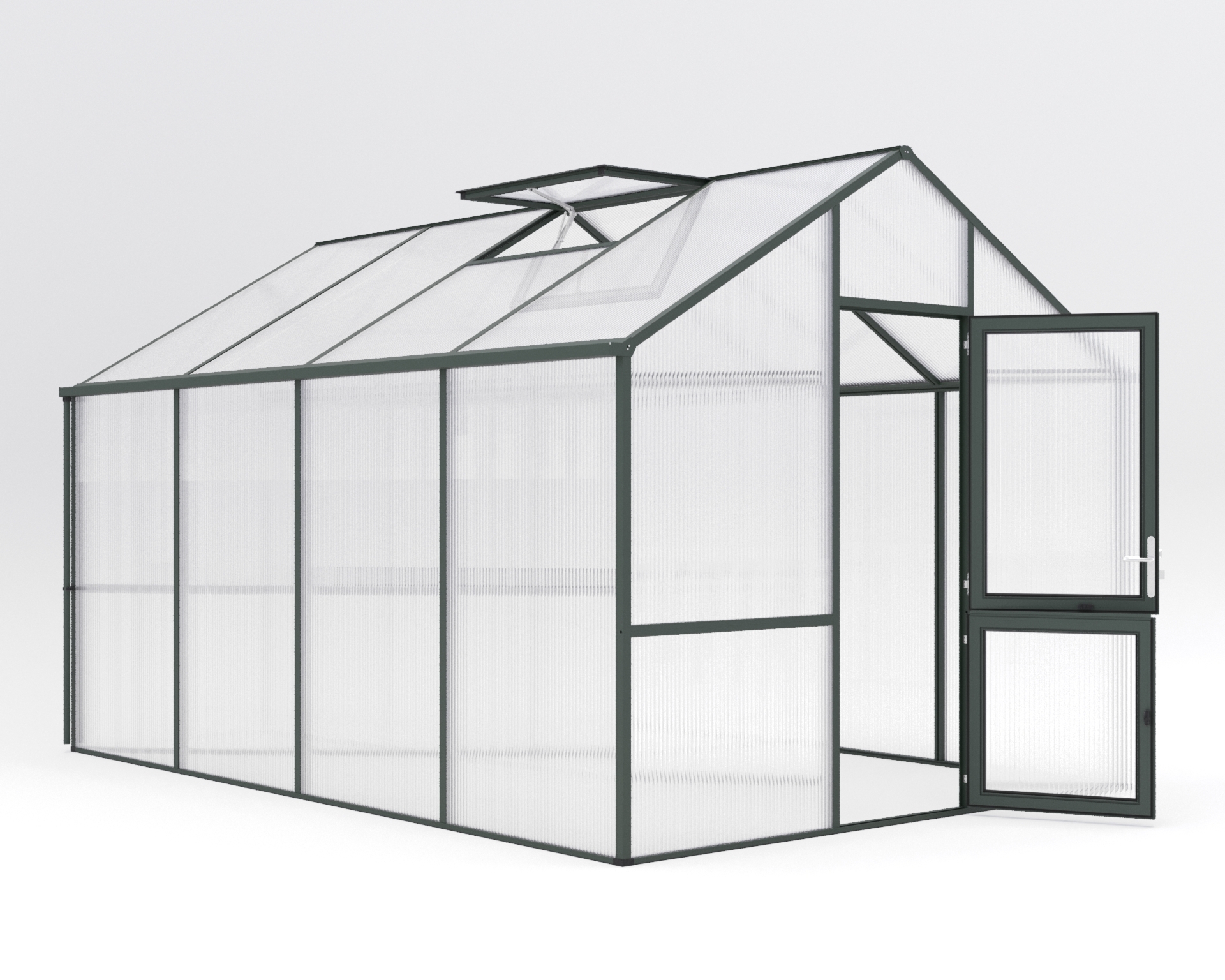 Gewächshaus Dahlie Sorgfältig gestaltet für leidenschaftliche Hobbygärtner – Das Gewächshaus Dahlie. Hier sind Innovation und Eleganz vereint, um die ultimative Umgebung für Ihre Pflanzen zu schaffen. Die Aluminiumkonstruktion vom Dahlie steht für außergewöhnliche Stabilität und Langlebigkeit. Durch die bewusste Entscheidung gegen Klammern und Kunststoffleisten wird nicht nur das ansprechende Erscheinungsbild bewahrt, sondern auch die Stabilität erhöht. Die raffinierte Belüftung von Dahlie wurde mit Effizienz im Sinn konzipiert. Die großzügige, geteilte Drehtür ermöglicht einen einfachen Zugang, während das geräumige Dachfenster mit automatischem Fensterheber für optimale Luftzirkulation sorgt. Ein rückseitiges Fenster mit Handaufsteller rundet das ausgeklügelte Belüftungssystem ab. Das Dahlie ist mit einer großzügigen Stehwandhöhe von 1,90 m ausgestattet, die ein komfortables Arbeiten in aufrechter Position ermöglicht. Vom Samen bis zur Ernte – Das Dahlie wird zu Ihrem verlässlichen Partner in jeder Wachstumsphase. Die 16 mm ISO-Hohlkammerplatten vom Dahlie sorgen für eine hervorragende Isolierung und schaffen optimale Bedingungen für das Pflanzenwachstum. Passen Sie Ihr Dahlie nach Ihrem Geschmack an. Wählen Sie zwischen den Farben “pressblank”, “tannengrün (RAL 6009)” und “anthrazit-grau (DB 703)” und verleihen Sie Ihrem Gewächshaus eine persönliche Note. Dahlie – Ihr privater Gartenraum mit unvergleichlicher Stehwandhöhe. Treten Sie ein und erleben Sie die Freude des Gärtnerns auf einem unerreichten Niveau. – Breite: 2,97, – Gewicht: 250, – Höhe: 2,76, – Länge: 4,29, – Material: Aluminium, – Produktart: Gewächshaus 1 Gewächshaus