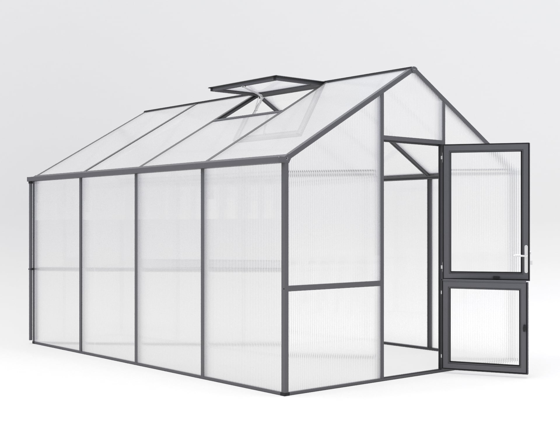 – Breite: 2,97, – Gewicht: 250, – Höhe: 2,76, – Länge: 4,29, – Material: Aluminium, – Produktart: Gewächshaus