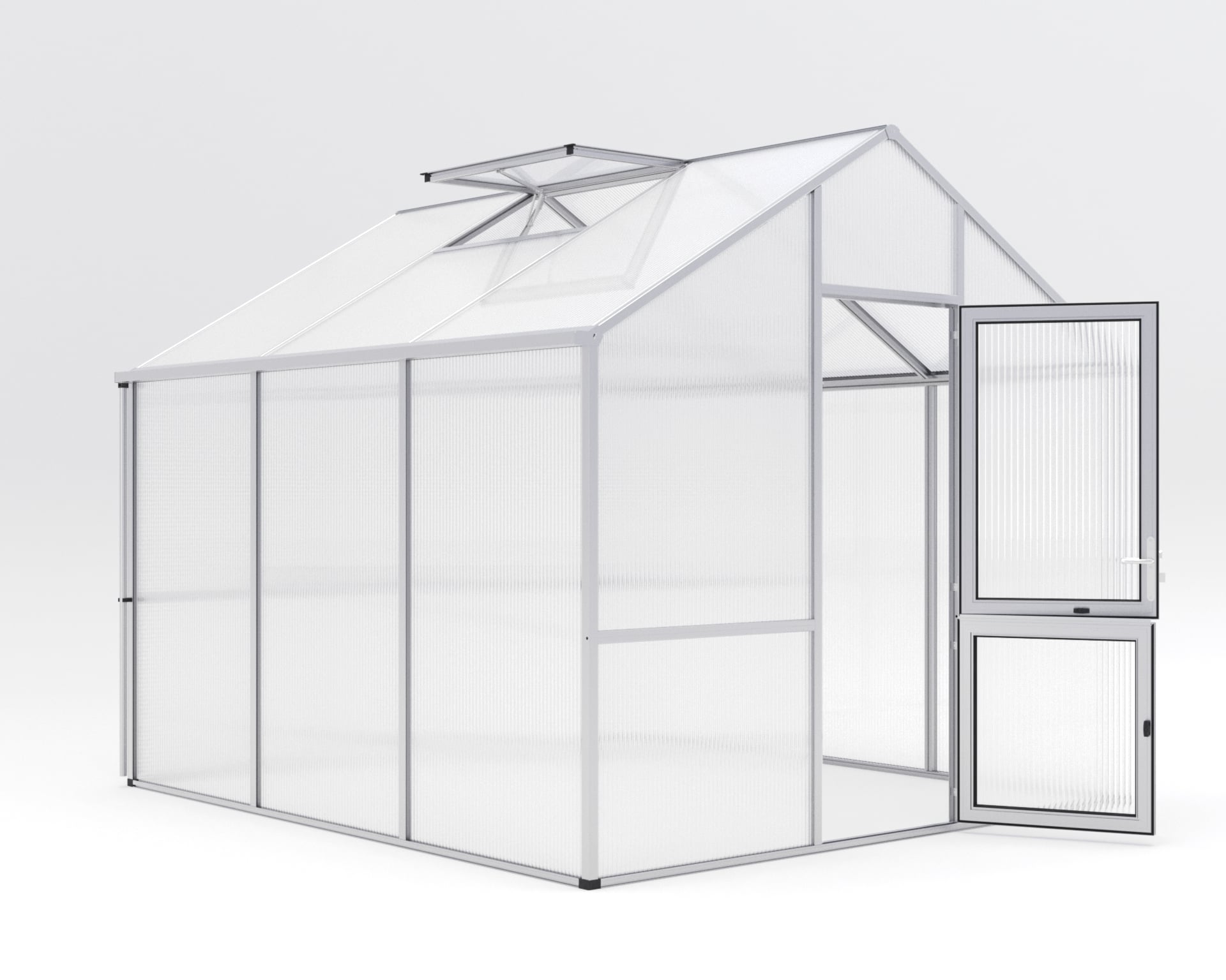 – Breite: 2,97, – Gewicht: 210, – Höhe: 2,76, – Länge: 3,23, – Material: Aluminium, – Produktart: Gewächshaus