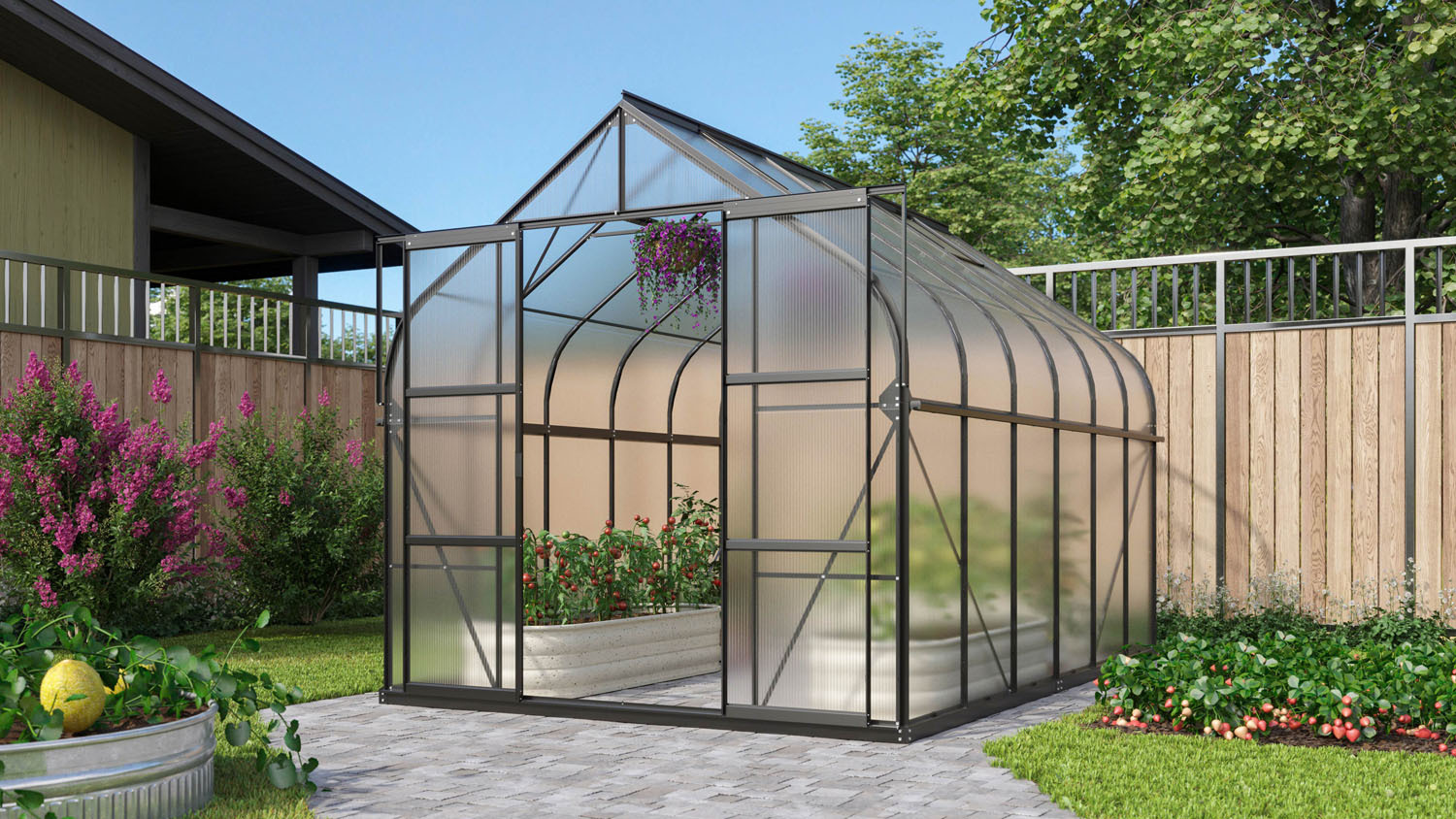Gewächshaus Dione 9900, inkl. Fundament Mit dem eleganten, formschönen Dione holen sich Hobbygärtnerinnen und -gärtner nicht nur ein Zuhause für ihre Pflanzen, sondern auch ein Schmuckstück in den eigenen Garten. Dank seines seitlich abgerundeten Dachs fügt es sich besonders harmonisch ins Landschaftsbild ein. Je nach hauptsächlichem Einsatz empfiehlt sich die Verglasung mit ca. 3 mm starkem, kristallklarem Sicherheitsglas (ESG) oder mit ca. 4 mm starken, UV-beschichteten Hohlkammerplatten. Die gebogenen Scheiben sind immer aus Polycarbonat, in der ESG-Version ist dieses aber klar, sodass kein Unterschied zu sehen ist. Sicherheitsglas, kristallklar (ESG) ist gehärtetes Glas, bricht daher nicht scharfkantig und sorgt somit für mehr Sicherheit. Durch die leichtgängige Doppelschiebetür mit einer Breite von 122 cm und einer Höhe von 200 cm ist das Dione bequem zu begehen. Es ist in fünf verschiedenen Größen mit den Grundflächen von 5 bis 11,5 m² und in drei Farben erhältlich: Aluminium eloxiert, Smaragd oder Schwarz (6700-11500) pulverbeschichtet. Für eine optimale Belüftung sorgen die 1 – 4 Dachfenster. Auch der Stahlfundamentrahmen aus verzinktem und farbbeschichtetem Stahlblech gehört zum LIeferumfang. Er sichert die Gleitfähigkeit der Schiebetüren, sorgt für die ebene , rechtwinklige Ausrichtung des Gewächshauses und kann direkt mit einem Punktfundamnt verbunden werden. Reichhaltiges Zubehör ist auch in den Farben Smaragd und Schwarz erhältlich. – Breite: 2635, – Gewicht: 80,9155, – Höhe: 2545, – Länge: 3830, – Material: Aluminium, Stahl, Polycarbonat, – Produktart: Gewächshaus