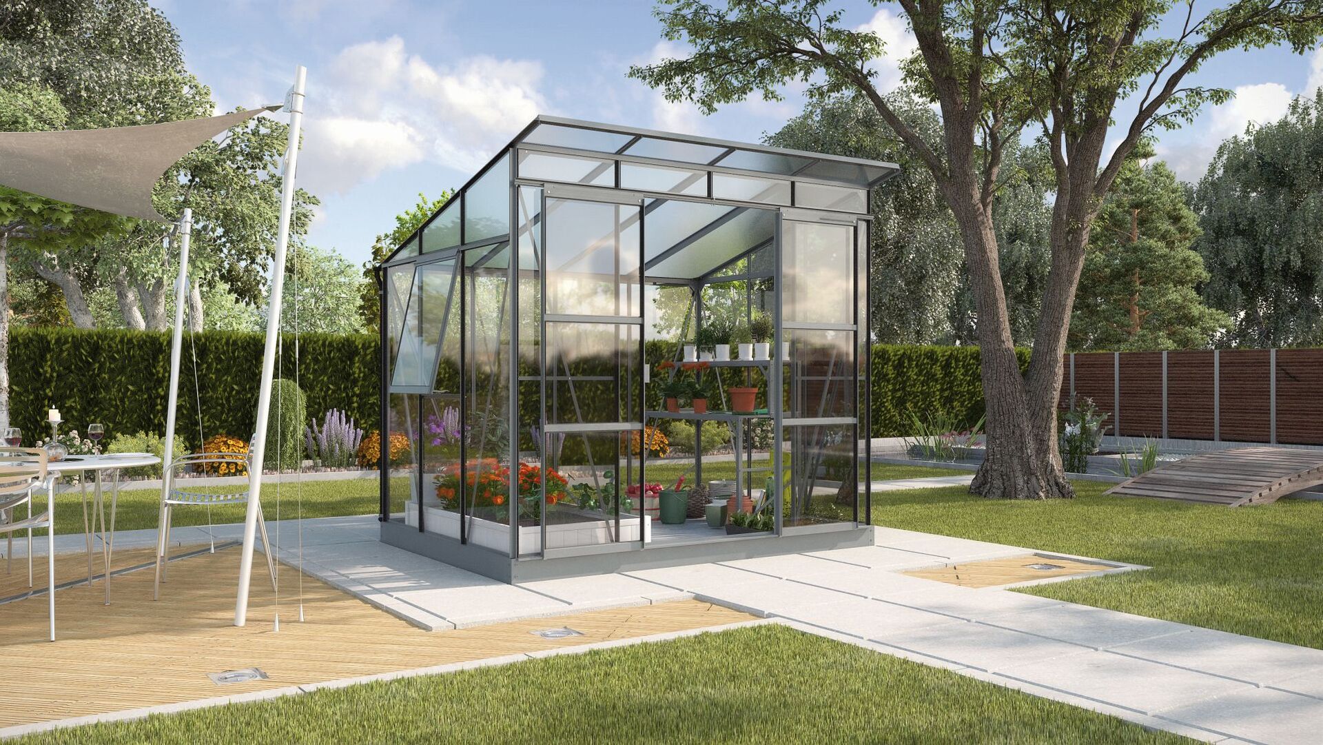 Gewächshaus Freya 5900 Mit diesem Gewächshaus setzen Sie architektonische Akzente in Ihrem Garten. Konzipiert mit einem Pultdach, breiter Front und hohen Seitenwänden besticht es durch ein großzügiges Design. Das Modell ist in zwei verschiedenen Größen mit den Grundflächen 5,9 und 7,6 m², in zwei Verglasungsartungen und in zwei Farben erhältlich: Aluminium eloxiert oder Anthrazit pulverbeschichtet. Die Kombiverglasung besteht in den Seiten aus ca. 3 mm starkem Sicherheitsglas, kristallklar (ESG) und im Dachbereich aus ca. 6 mm starken Hohlkammerplatten (HKP). Diese schützen die Pflanzen gegen zu starke Sonneneinstrahlung, sorgen für eine ausgeglichene Temperatur und sind weniger empfindlich gegen herabfallende Äste oder dergleichen. Das leicht geneigte Dach lässt viel Sonne in das Gewächshaus. Mit Seitenwänden und -fenstern aus Hohlkammerplatten kann das Freya in seinen Isoliereigenschaften optimiert werden, empfehlenswert z.B. bei einem geplanten Einsatz im Winter. Der geringe Höhenunterschied des Pultdachs gewährleistet durchgehend eine angenehme Stehhöhe und bietet hochwachsenden Pflanzen genügend Raum sich frei zu entfalten. Ein bis zwei aufstellbare Seitenfenster geben dem Haus wohnliches Flair. Die leichtgängige, breite Doppelschiebetür mit einer Breite von 1,22 m und einer Höhe von 1,92 m bietet großzügigen Zugang und eine zusätzliche Belüftungsmöglichkeit. Die Regenrinne und zwei Regenfallrohre (L 1,50 m, Ø 32 mm) gehören ebenfalls zur Standardausstattung. Das Modell 7600 ist zusätzlich mit einem Lamellenfenster ausgestattet. Das Gerüst besteht aus schmalen Aluminiumleisten. Da Aluminium ein extrem stabiles und widerstandsfähiges Material ist, genügen die feinen Leisten um langfristig für einen stabilen Stand zu sorgen. So ist Ihnen andauernde Freude an Ihrem Gewächshaus garantiert. Maße: Größe 5,9 m² – 2294 x 2580 x 2249 mm Größe 7,6 m² – 2916 x 2580 x 2404 mm – Breite: 2580, – Gewicht: 163,425, – Höhe: 2249, – Länge: 2294