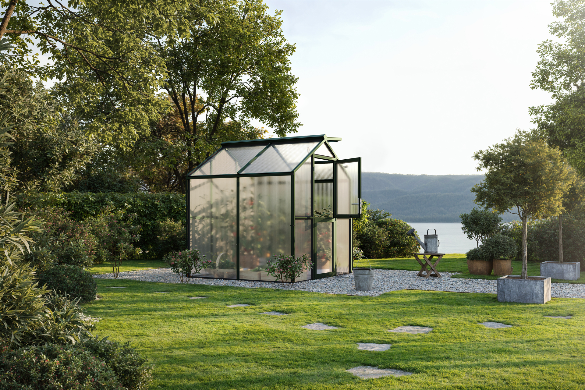 Das innovative Aluminium-Gewächshaus Galant eignet sich mit der Breite von ca. 2,16 m perfekt für den Kleingarten oder Schrebergarten. Mit einer Traufhöhe von ca. 1,72 m ist genügend Raum vorhanden, um der Kreativität freien Lauf zu lassen. Es fungiert z.B. als reines Gewächshaus, zur Anzucht von Pflanzen, Gemüse etc. oder als grüne Oase zur Entspannung. Selbstverständlich bietet sich auch eine Kombination aus beidem an. Damit sich das Gewächshaus optimal in den Garten einfügen lässt, stehen drei Farbausführungen zur Auswahl. Die pressblanke Aluminium-Ausführung sowie den pulverbeschichteten Profilsystemen in tannengrün oder anthrazit-grau. Zur Grundausstattung gehört neben den zwei Dachfenstern (bei Typ 2 = ein Dachfenster) mit automatischen Fensteröffnern, eine geteilte Drehtür mit abschließbarem Türdrücker. Die Tür lässt sich im geöffneten Zustand mittels starken Magneten am Gewächshaus fixieren. Zusammen sorgen diese beiden Komponenten für effektive Lüftungsmöglichkeiten und ein gutes Klima im Gewächshaus. Des Weiteren gehören zum Lieferumfang beidseitig große Regenrinnen, inkl. Aluminium-Fallrohren, mit denen das Regenwasser gezielt umgeleitet werden kann. Die Verglasung im Giebel- und Traufbereich sind je nach Nutzungsabsicht wählbar (ISO-Hohlkammerplatten 10 mm oder Echtglas 4 mm ESG). Für die ideale Innenraum-Nutzung des Gewächshauses bieten wir, wie bei den anderen Gewächshaus-Modellen auch, passende Regale, Pflanztische und Hängeborde an. Um das Gewächshaus idealerweise zu gründen, empfiehlt sich der Fundamentrahmen aus Aluminium, der ebenfalls als Zubehör erhältlich ist. Sie sehen schon – Wir werden allen Ansprüchen gerecht.