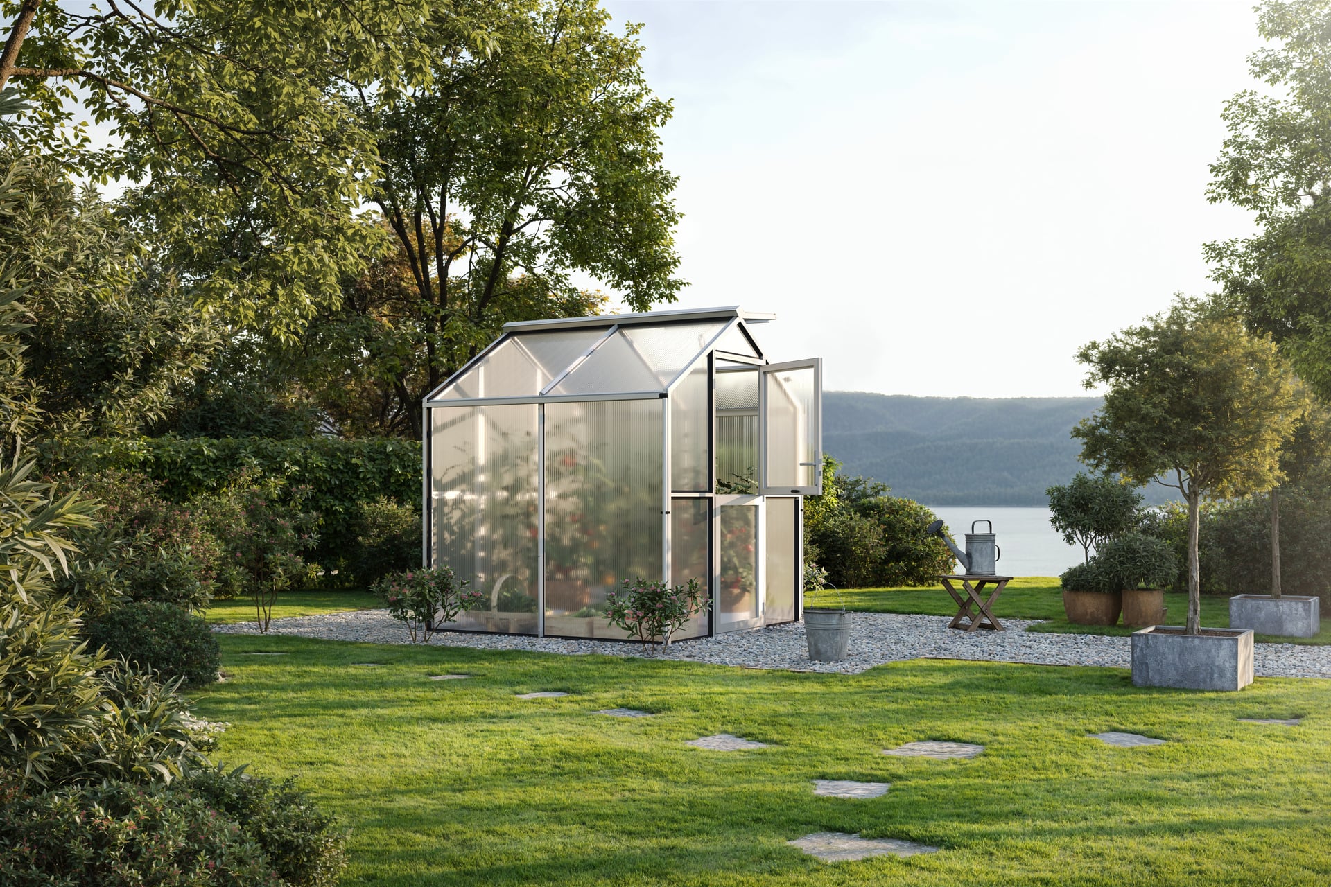 Das innovative Aluminium-Gewächshaus Galant eignet sich mit der Breite von ca. 2,16 m perfekt für den Kleingarten oder Schrebergarten. Mit einer Traufhöhe von ca. 1,72 m ist genügend Raum vorhanden, um der Kreativität freien Lauf zu lassen. Es fungiert z.B. als reines Gewächshaus, zur Anzucht von Pflanzen, Gemüse etc. oder als grüne Oase zur Entspannung. Selbstverständlich bietet sich auch eine Kombination aus beidem an. Damit sich das Gewächshaus optimal in den Garten einfügen lässt, stehen drei Farbausführungen zur Auswahl. Die pressblanke Aluminium-Ausführung sowie den pulverbeschichteten Profilsystemen in tannengrün oder anthrazit-grau. Zur Grundausstattung gehört neben den zwei Dachfenstern (bei Typ 2 = ein Dachfenster) mit automatischen Fensteröffnern, eine geteilte Drehtür mit abschließbarem Türdrücker. Die Tür lässt sich im geöffneten Zustand mittels starken Magneten am Gewächshaus fixieren. Zusammen sorgen diese beiden Komponenten für effektive Lüftungsmöglichkeiten und ein gutes Klima im Gewächshaus. Des Weiteren gehören zum Lieferumfang beidseitig große Regenrinnen, inkl. Aluminium-Fallrohren, mit denen das Regenwasser gezielt umgeleitet werden kann. Die Verglasung im Giebel- und Traufbereich sind je nach Nutzungsabsicht wählbar (ISO-Hohlkammerplatten 10 mm oder Echtglas 4 mm ESG). Für die ideale Innenraum-Nutzung des Gewächshauses bieten wir, wie bei den anderen Gewächshaus-Modellen auch, passende Regale, Pflanztische und Hängeborde an. Um das Gewächshaus idealerweise zu gründen, empfiehlt sich der Fundamentrahmen aus Aluminium, der ebenfalls als Zubehör erhältlich ist. Sie sehen schon – Wir werden allen Ansprüchen gerecht.