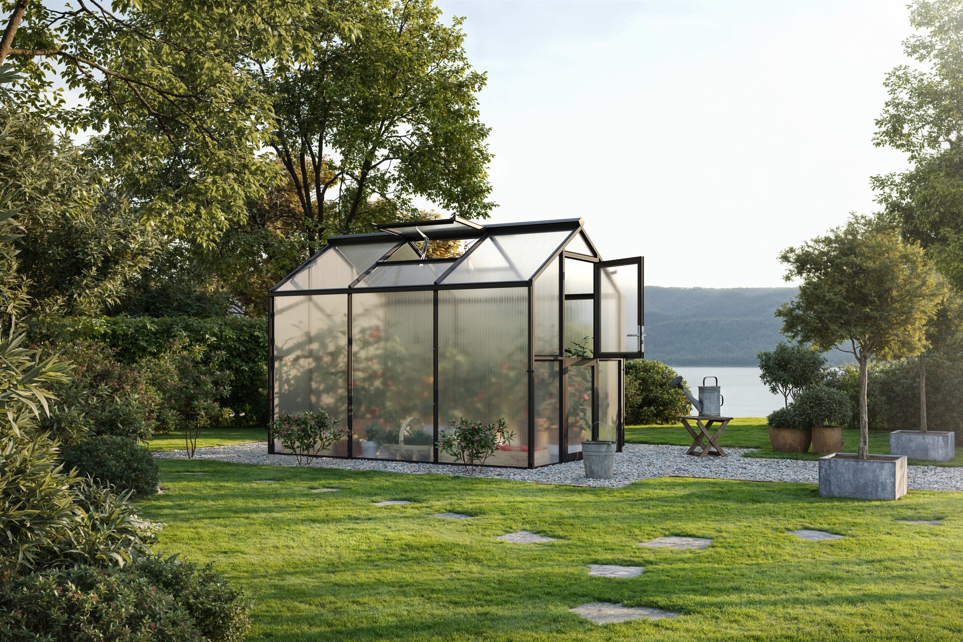 Gewächshaus Galant III Das innovative Aluminium-Gewächshaus Galant eignet sich mit der Breite von ca. 2,16 m perfekt für den Kleingarten oder Schrebergarten. Mit einer Traufhöhe von ca. 1,72 m ist genügend Raum vorhanden, um der Kreativität freien Lauf zu lassen. Es fungiert z.B. als reines Gewächshaus, zur Anzucht von Pflanzen, Gemüse etc. oder als grüne Oase zur Entspannung. Selbstverständlich bietet sich auch eine Kombination aus beidem an. Damit sich das Gewächshaus optimal in den Garten einfügen lässt, stehen drei Farbausführungen zur Auswahl. Die pressblanke Aluminium-Ausführung sowie den pulverbeschichteten Profilsystemen in tannengrün oder anthrazit-grau. Zur Grundausstattung gehört neben den zwei Dachfenstern (bei Typ 2 = ein Dachfenster) mit automatischen Fensteröffnern, eine geteilte Drehtür mit abschließbarem Türdrücker. Die Tür lässt sich im geöffneten Zustand mittels starken Magneten am Gewächshaus fixieren. Zusammen sorgen diese beiden Komponenten für effektive Lüftungsmöglichkeiten und ein gutes Klima im Gewächshaus. Des Weiteren gehören zum Lieferumfang beidseitig große Regenrinnen, inkl. Aluminium-Fallrohren, mit denen das Regenwasser gezielt umgeleitet werden kann. Die Verglasung im Giebel- und Traufbereich sind je nach Nutzungsabsicht wählbar (ISO-Hohlkammerplatten 10 mm oder Echtglas 4 mm ESG). Für die ideale Innenraum-Nutzung des Gewächshauses bieten wir, wie bei den anderen Gewächshaus-Modellen auch, passende Regale, Pflanztische und Hängeborde an. Um das Gewächshaus idealerweise zu gründen, empfiehlt sich der Fundamentrahmen aus Aluminium, der ebenfalls als Zubehör erhältlich ist. Sie sehen schon – Wir werden allen Ansprüchen gerecht. – Breite: 2,16, – Gewicht: 162, – Höhe: 2,38, – Länge: 3,08, – Material: Aluminium, – Produktart: Gewächshaus 1 Gewächshaus