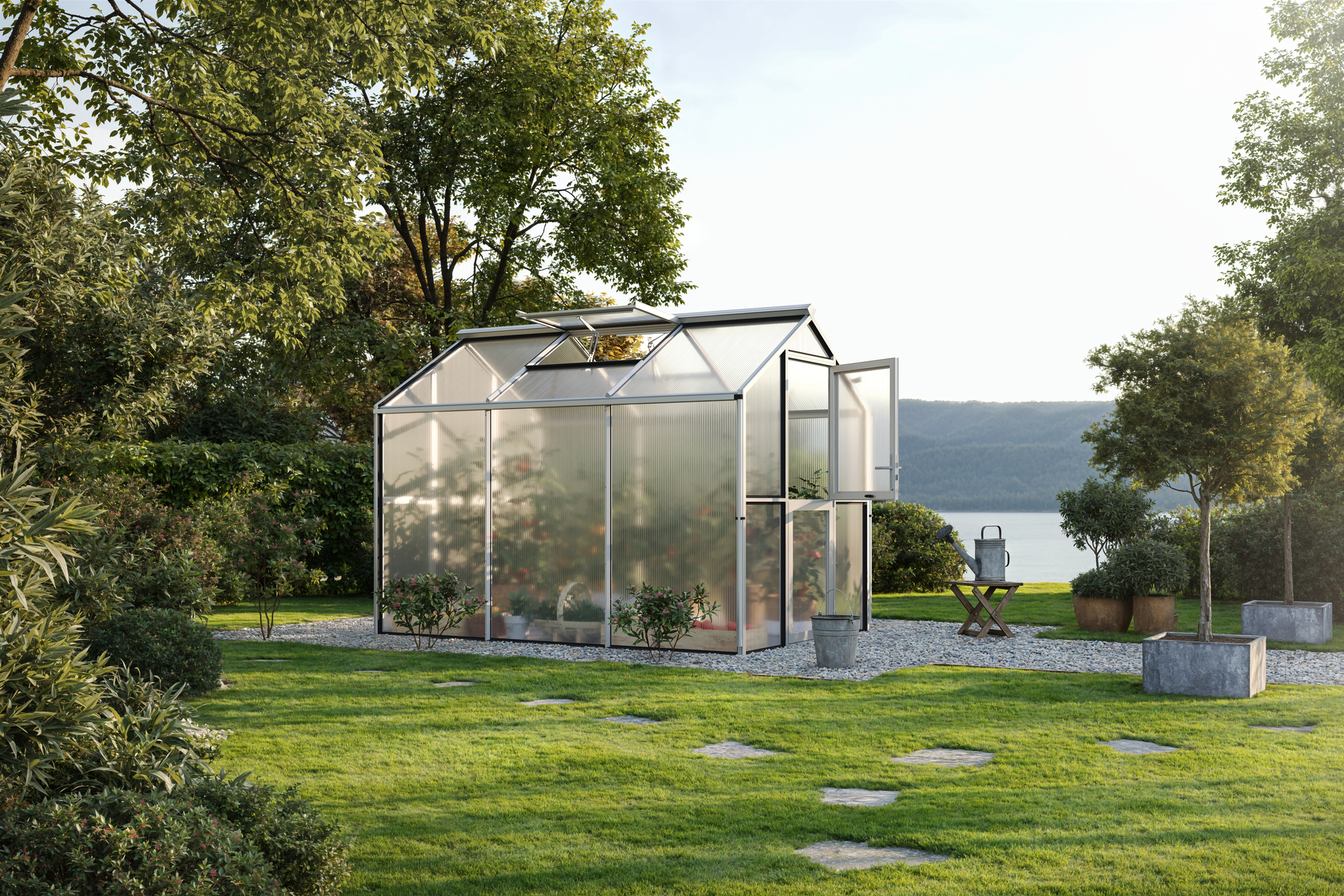 Gewächshaus Galant III Das innovative Aluminium-Gewächshaus Galant eignet sich mit der Breite von ca. 2,16 m perfekt für den Kleingarten oder Schrebergarten. Mit einer Traufhöhe von ca. 1,72 m ist genügend Raum vorhanden, um der Kreativität freien Lauf zu lassen. Es fungiert z.B. als reines Gewächshaus, zur Anzucht von Pflanzen, Gemüse etc. oder als grüne Oase zur Entspannung. Selbstverständlich bietet sich auch eine Kombination aus beidem an. Damit sich das Gewächshaus optimal in den Garten einfügen lässt, stehen drei Farbausführungen zur Auswahl. Die pressblanke Aluminium-Ausführung sowie den pulverbeschichteten Profilsystemen in tannengrün oder anthrazit-grau. Zur Grundausstattung gehört neben den zwei Dachfenstern (bei Typ 2 = ein Dachfenster) mit automatischen Fensteröffnern, eine geteilte Drehtür mit abschließbarem Türdrücker. Die Tür lässt sich im geöffneten Zustand mittels starken Magneten am Gewächshaus fixieren. Zusammen sorgen diese beiden Komponenten für effektive Lüftungsmöglichkeiten und ein gutes Klima im Gewächshaus. Des Weiteren gehören zum Lieferumfang beidseitig große Regenrinnen, inkl. Aluminium-Fallrohren, mit denen das Regenwasser gezielt umgeleitet werden kann. Die Verglasung im Giebel- und Traufbereich sind je nach Nutzungsabsicht wählbar (ISO-Hohlkammerplatten 10 mm oder Echtglas 4 mm ESG). Für die ideale Innenraum-Nutzung des Gewächshauses bieten wir, wie bei den anderen Gewächshaus-Modellen auch, passende Regale, Pflanztische und Hängeborde an. Um das Gewächshaus idealerweise zu gründen, empfiehlt sich der Fundamentrahmen aus Aluminium, der ebenfalls als Zubehör erhältlich ist. Sie sehen schon – Wir werden allen Ansprüchen gerecht. – Breite: 2,16, – Gewicht: 162, – Höhe: 2,38, – Länge: 3,08, – Material: Aluminium, – Produktart: Gewächshaus 1 Gewächshaus