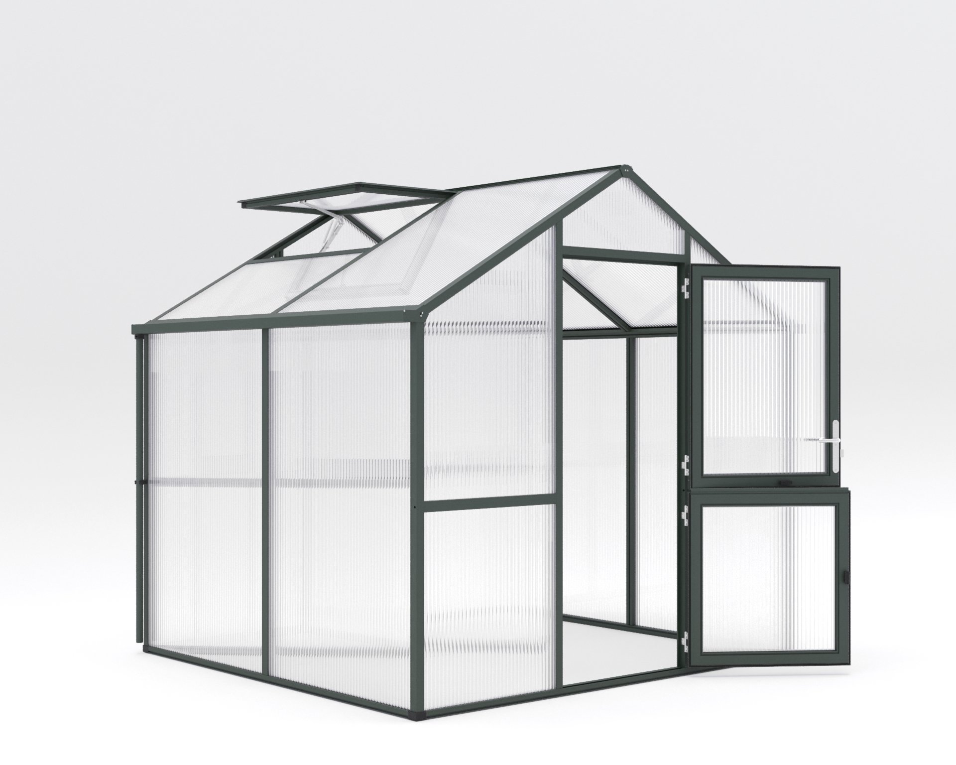 Gewächshaus Iris Iris ist mehr als nur ein Gewächshaus – es ist Ihr kreativer Raum, für Ihre Pflanzenanzucht und Pflege, in dem Sie Ihrer Gartenleidenschaft in vollem Umfang nachgehen können. Die Aluminiumkonstruktion des Gewächshauses Iris besticht durch ihre Stabilität und Langlebigkeit. Ohne störende Klammern und Kunststoffleisten strahlt es schlichte Eleganz aus. Dieses Gewächshaus wurde geschaffen, um Sie ganzjährig in jeder Pflanzphase zu begleiten. Dank der 16 mm ISO-Hohlkammerplatten sind Ihre Pflanzen auch bei kühleren Temperaturen gut geschützt. Die intelligente Belüftung vom Iris ermöglicht optimale Wachstumsbedingungen. Die breite, geteilte Drehtür bietet bequemen Zugang, während das großzügige Dachfenster mit automatischem Fensterheber für frische Luft sorgt. Das praktische Rückwandfenster mit Handaufsteller vervollständigt das ausgeklügelte Belüftungssystem. Die komfortable Stehwandhöhe von 1,60 m ermöglicht bequemes stehen und arbeiten in aufrechter Haltung. Von der Aussaat bis zur Ernte – Iris macht jede gärtnerische Aufgabe angenehm. Das Gewächshaus Iris bietet Ihnen nicht nur eine funktionale Umgebung. Wählen Sie zwischen den Farben “pressblank”, “tannengrün (RAL 6009)” und “anthrazit-grau (DB 703)” und verleihen Sie Ihrem Gewächshaus eine persönliche Note. Tauchen Sie ein und erleben Sie die Faszination des Gärtnerns in seiner schönsten Form. – Breite: 2,33, – Gewicht: 138, – Höhe: 2,26, – Länge: 2,17, – Material: Aluminium, – Produktart: Gewächshaus 1 Gewächshaus