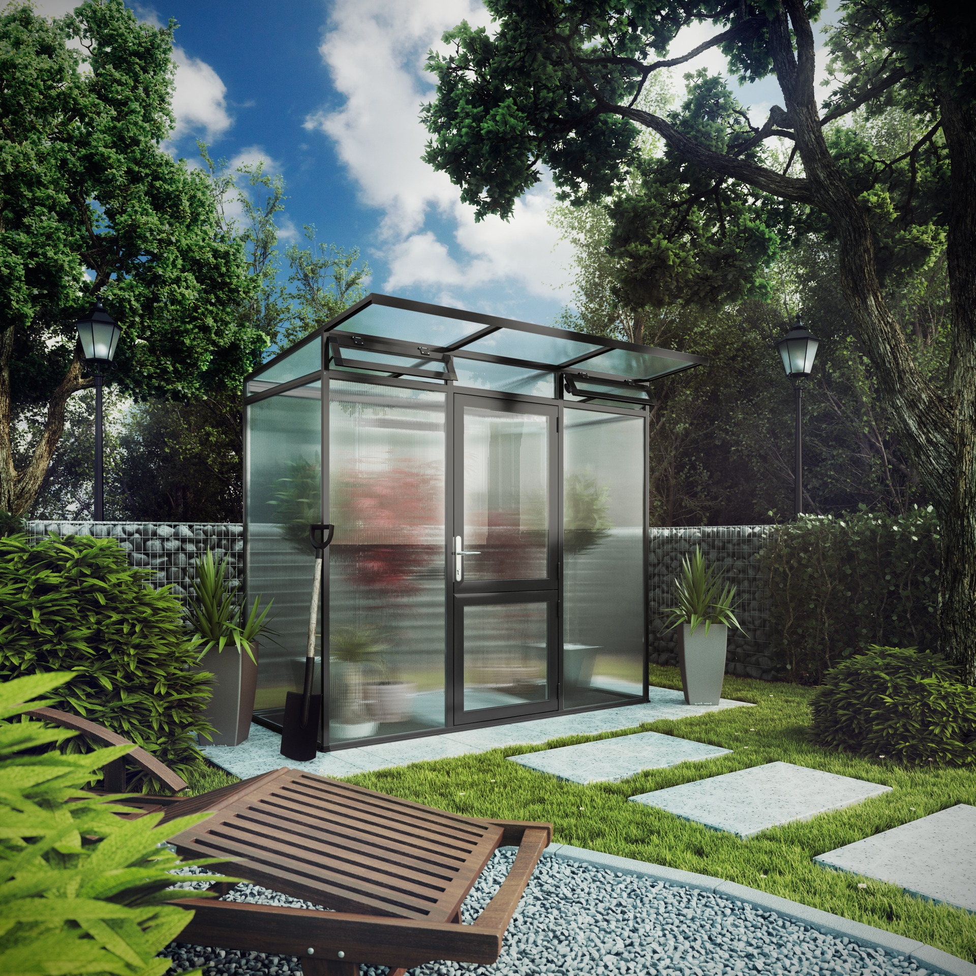 Gewächshaus Linea Das Pultdach-Gewächshaus Linea (Farbe: anthrazit-grau DB 703) mit 10 mm Hohlkammerplatten besticht nicht nur durch sein harmonisches Design. Die Bauweise mit Pultdach sorgt auch für einen hohen Lichteinfall und die angenehme Stehwandhöhe ermöglicht ergonomisches Gärtnern. Dank der durchgängigen Aluminiumprofile und der ausgereiften Verglasungstechnik, ohne Klammern und Kunststoffleisten ist nicht nur enorme Stabilität, sondern auch hohe Sicherheit gewährleistet. Die breite, geteilte Drehtür mit abschließbarem Türgriff sorgt für einen bequemen und geschützten Zugang in Ihr Gewächshaus. Das große Rückwandfenster inkl. Handaufsteller ermöglicht in Kombination mit den zwei vorderen Aufstellfenstern – ebenfalls mit Handaufstellern – eine gute Belüftung, sodass Ihren Pflanzen an nichts mangeln wird. Über die Dachrinne mit Fallrohr lässt sich Regenwasser zur Bewässerung sammeln. Sie können das Gewächshaus mit dem KGT Hängebord, Tischgestell oder der Pflanzwanne erweitern. – Breite: 2,33, – Dach: Pultdach, – Farbe: anthrazit-grau, – Fenster: 3,0, – Firsthöhe: 2200mm, – Fläche: 2,56m², – Höhe: 2,2, – Länge: 1,1, – Material: Aluminium, – Produktart: Gewächshaus, – Schließung: Profilzylinder, – Türart: Geteilte Drehtür (abschließbar) 1 Gewächshaus