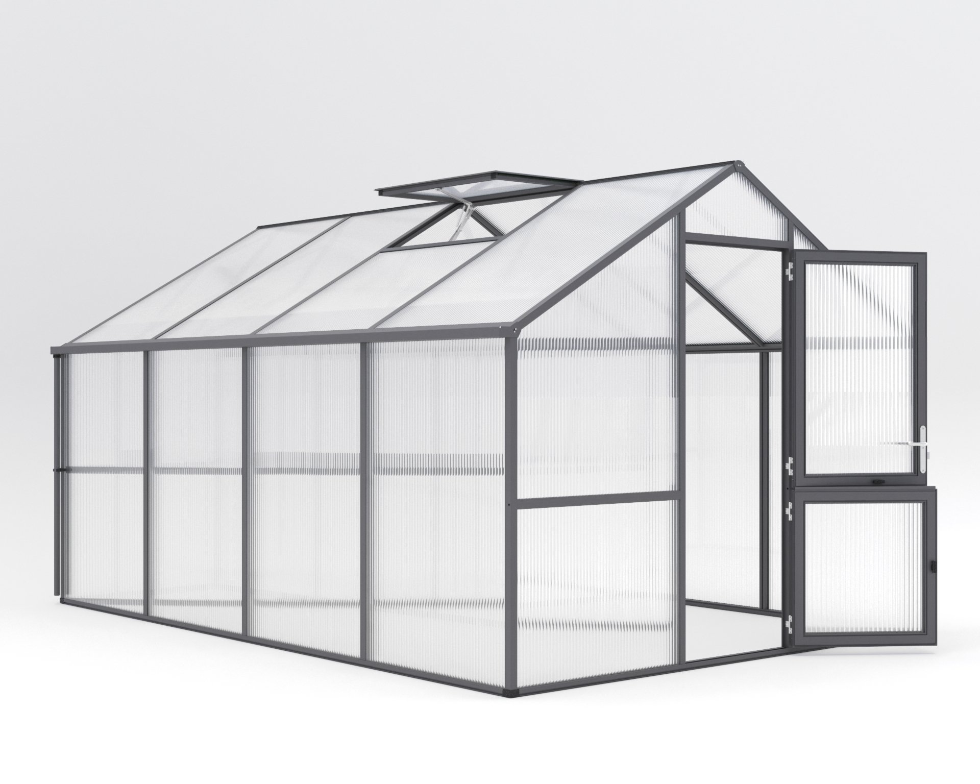 – Breite: 2,97, – Gewicht: 225, – Höhe: 2,44, – Länge: 4,29, – Material: Aluminium, – Produktart: Gewächshaus