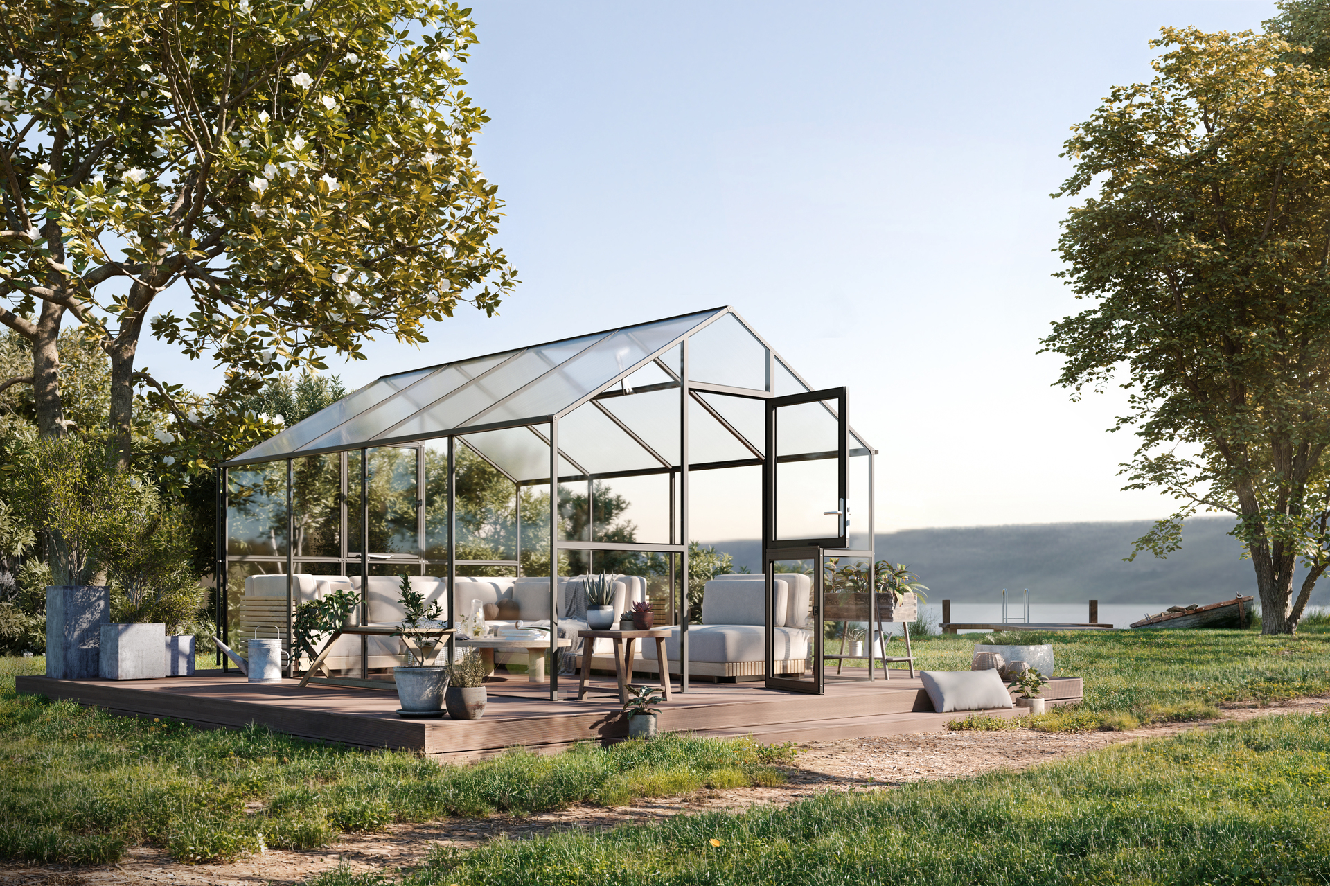 Das KGT Gewächshaus Ortasia vereint großzügige Raumverhältnisse mit einer hochwertigen, robusten Bauweise. Mit einer Breite von 2,97 m und einer Länge von 4,29 m bietet es deutlich mehr Platz als kleinere Modelle, was es ideal für den ambitionierten Gärtner und gleichzeitig als gemütlichen Rückzugsort macht. Die komfortable Stehwandhöhe von 1,69 m ermöglicht dabei ein bequemes Arbeiten und entspanntes Verweilen im Gewächshaus. Ein herausragendes Merkmal des Ortasia ist die Verglasung: In den Seiten und im Giebel sorgt 4 mm starkes Einscheiben-Sicherheitsglas (ESG) für besondere Stabilität und Sicherheit. Die klare Glasoptik schafft eine helle, offene Atmosphäre und lädt dazu ein, das Ortasia nicht nur als Gewächshaus zu nutzen, sondern auch als Wohlfühloase im eigenen Garten. Wie bei allen KGT Gewächshäusern stehen auch beim Ortasia zahlreiche Qualitätsmerkmale im Vordergrund. Die Konstruktion aus hochstabilen, rostfreien Aluminiumprofilen, die zusätzlich mit einer hochwertigen Pulverbeschichtung in Anthrazit-Grau (DB 703) versehen sind, sorgt für eine äußerst langlebige Struktur und eine elegante Optik. Die volleingefasste Verglasung verzichtet auf sichtbare Klammern und bietet dadurch sowohl optische Eleganz als auch zusätzliche Sicherheit. Der Zugang zum Gewächshaus erfolgt durch eine breite, geteilte Drehtür, die mit einem abschließbaren Türdrücker versehen ist, was sowohl praktisch als auch sicher ist. Für eine optimale Luftzirkulation verfügt das Ortasia über ein großes Dachfenster mit automatischem Fensterheber sowie ein Rückwandfenster mit Handaufsteller, um stets für frische Luft im Inneren zu sorgen. Die beidseitigen Regenrinnen mit Aluminium-Fallrohren ermöglichen zudem eine effiziente Ableitung von Regenwasser. Das Ortasia ist die größere Version des Modells Aptasia und bietet aufgrund seiner Breite von 2,97 m noch mehr Platz für Pflanzen und gemütliche Stunden im Grünen. Mit dem KGT Ortasia erhalten Sie ein hochwertiges, langlebiges Gewächshaus, das sowohl funktionale Ansprüche erfüllt als auch durch seine Größe, Langlebigkeit und elegante Optik überzeugt.