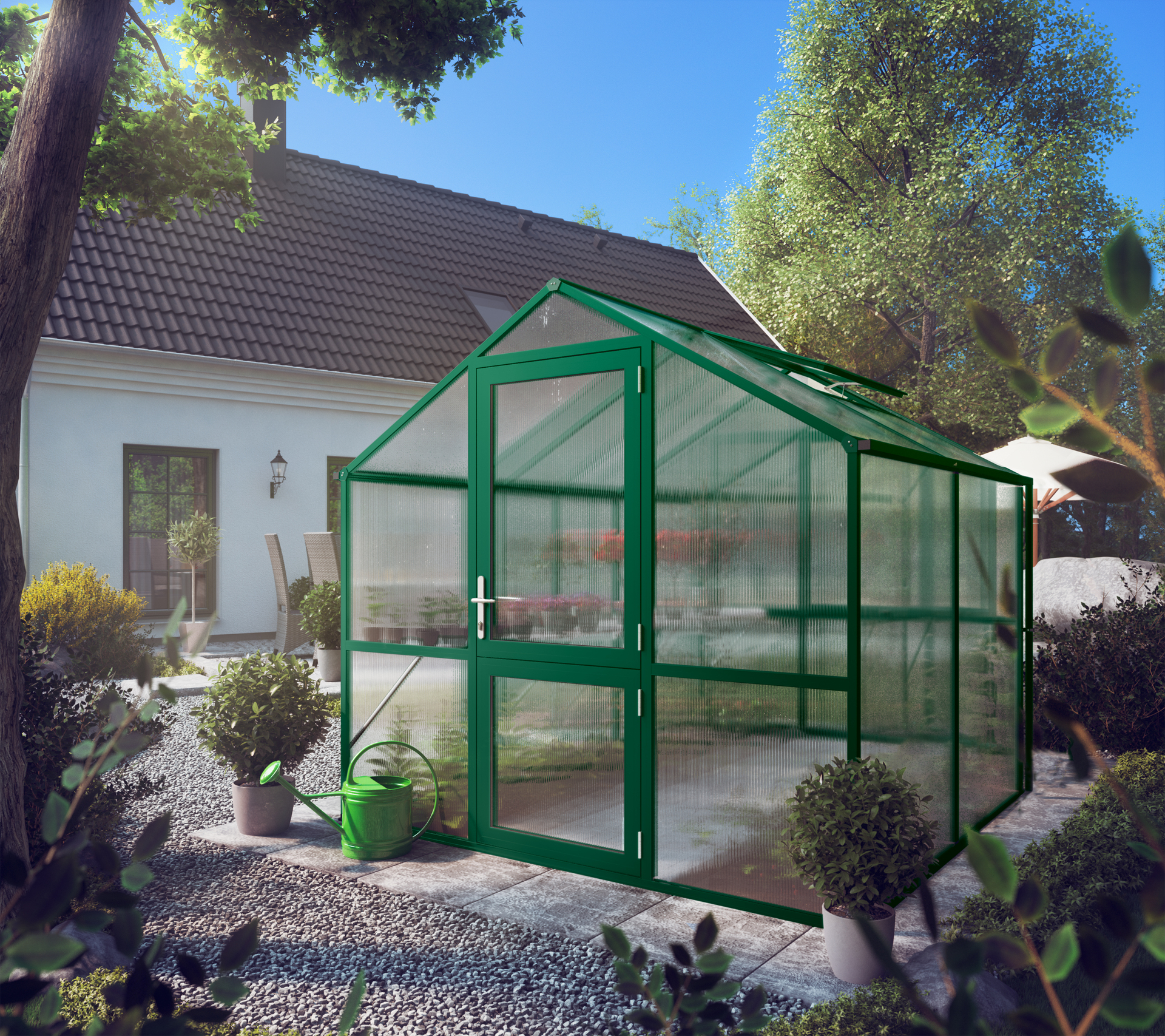 Das Aluminium-Gewächshaus Rose (Farbe: moosgrün RAL 6005) wurde speziell für den anspruchsvollen Hobbygärtner entwickelt. Die transparenten ISO-Hohlkammerplatten haben eine Stärke von 10 mm und werden komplett von den Profilen umschlossen, so dass ein Herumfliegen der Platten ausgeschlossen ist. Es werden keine Klammern oder ähnliche Kleinteile zur Befestigung der Hohlkammerplatten verwendet. Die Verglasung trägt somit einen großen Teil zur Stabilität bei. Eine Beschattung ist grundsätzlich nicht erforderlich, da keine UV-Strahlen durch die Hohlkammerplatten eindringen und Ihre Pflanzen somit vor dem Verbrennen geschützt werden. Ein weiterer Vorteil der Hohlkammerplatten ist der hohe Isolierwert, durch den die nützliche Wärme länger im Gewächshaus gespeichert wird. Durch die Stehwandhöhe von 1,49 m und einer großzügigen Firsthöhe von 2,15 m ist jede Menge Raum für Sie und Ihre Pflanzen vorhanden. So können auch Tomaten und Gurken problemlos in die Höhe wachsen und sich vollends entfalten. Neben der geteilten Drehtür und dem Rückwandfenster mit Handaufsteller verfügt das Gewächshaus Rose über ein Dachfenster mit automatischem Fensterheber. Damit wird eine optimale Be- und Entlüftung gewährleistet. Um zu sichern was Ihnen lieb ist, ist im Standard-Lieferumfang eine hochwertige, abschließbare Hoppe-Drückergarnitur enthalten. Das Design der einzigartigen Tür wird durch die leichtgängigen, innenliegenden Türscharniere abgerundet. Mit dem Standardlieferumfang erhalten Sie zusätzlich eine beidseitige Regenrinne mit Fallrohren (Länge: 1,40 m). Alle wichtigen Profile (First-, Rinnen- und Bodenprofile) sind in einem Stück ausgeführt und sorgen für extra hohe Stabilität. Potenzielle Leckagen werden somit ebenfalls vermieden. Die einfache Steck- / Schraub-Verbindungstechnik bietet in Kombination mit der leicht verständlichen Montageanleitung die perfekte Grundlage für eine einfache Eigenmontage. Die umfangreiche Serienausstattung kann durch passgenaues Zubehör (Fundamentrahmen, Hängebord, Tischgestell, Pflanzwanne) ergänzt werden.