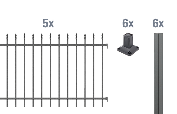 5 Zaunfeld Chaussee, Aluminium, anthrazit, 2000×1200, 6 Zaunpfosten Chaussee, Circle, Aluminium, anthrazit, zum Einbetonieren51x51/1700, 6 Pfostenträger Chaussee, Circle, Aluminium, anthrazit, zum Aufschrauben,