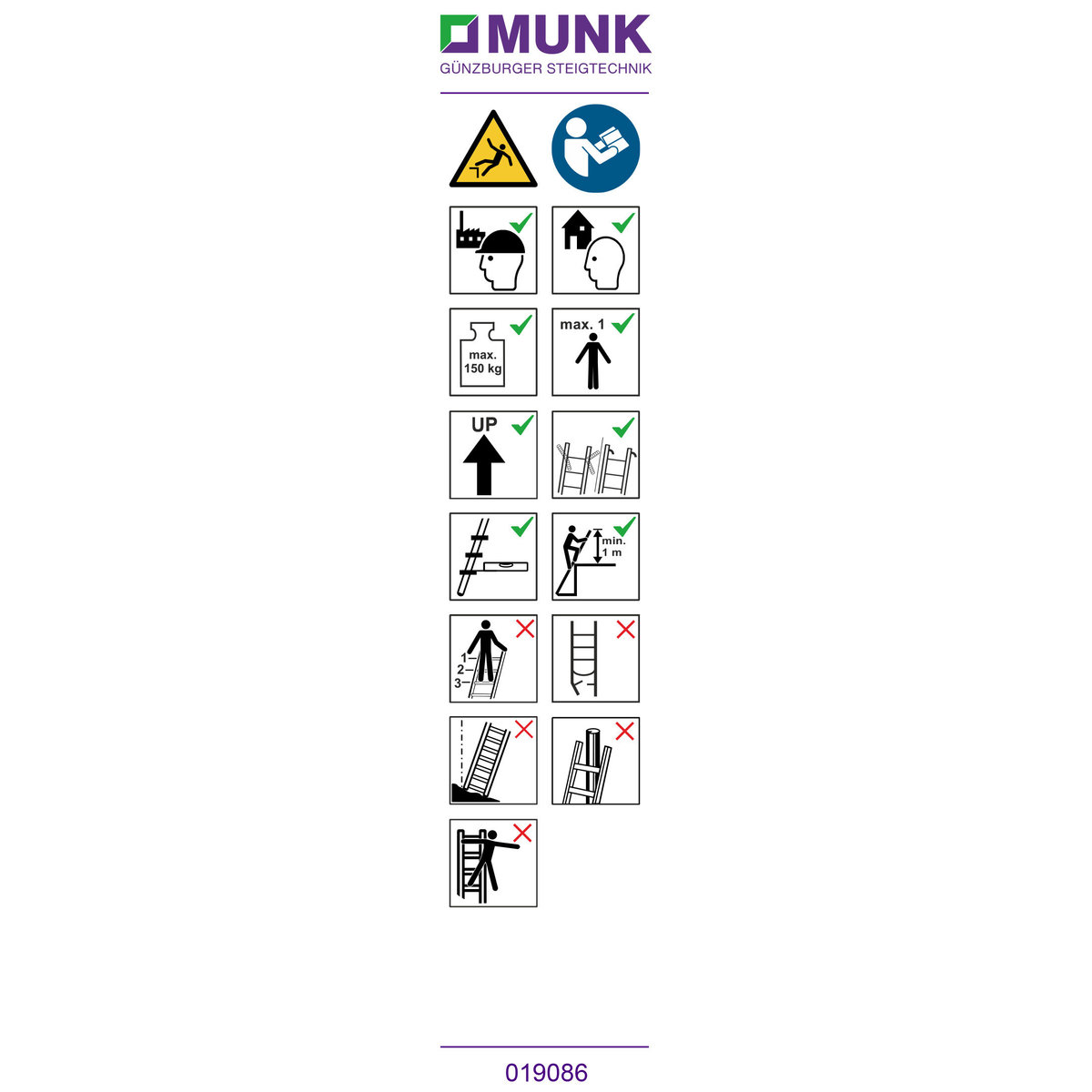 Klare Piktogramme zur Veranschaulichung der Sicherheitshinweise Klare und leicht verständliche Piktogramme zur sicheren Anwendung Unterstützung der Benutzer bei der sicheren Handhabung und Nutzung der Leiter Sorgt für eine sichere Handhabung von Leitern mit Stufen und Sprossen Gemäß DIN EN 131-3 sind produktspezifische Aufkleber mit Benutzerhinweisen anzubringen. Die Erklärung zu den verwendeten Piktogrammen finden Sie unter www.steigtechnik.de 1 VE = 20 StückInformationen zu Nachhaltigkeitskriterien Unternehmenszertifizierung: ISO 9001 Unternehmenszertifizierung: EN 1090 Unternehmenszertifizierung: EcoVadis RoHS REACH Die MUNK Group arbeitet mit einem Code of Conduct Das Lieferkettengesetz findet aufgrund unserer Größe keine Anwendung Die verwendeten Materialien sind der technischen Spezifikation aufgeführt Ressourcenschonende Herstellung: eigene Photovoltaik-Anlagen Energieeffizien…