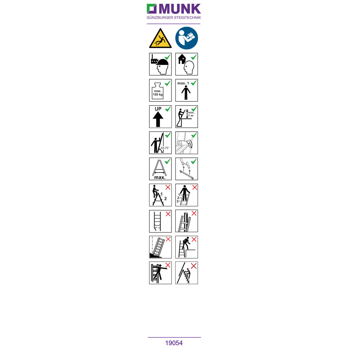 Klare Piktogramme zur Veranschaulichung der Sicherheitshinweise Klare und leicht verständliche Piktogramme zur sicheren Anwendung Unterstützung der Benutzer bei der sicheren Handhabung und Nutzung der Leiter Sorgt für eine sichere Handhabung von Leitern mit Stufen und Sprossen Gemäß DIN EN 131-3 sind produktspezifische Aufkleber mit Benutzerhinweisen anzubringen. Die Erklärung zu den verwendeten Piktogrammen finden Sie unter www.steigtechnik.de 1 VE = 20 StückInformationen zu Nachhaltigkeitskriterien Unternehmenszertifizierung: ISO 9001 Unternehmenszertifizierung: EN 1090 Unternehmenszertifizierung: EcoVadis RoHS REACH Die MUNK Group arbeitet mit einem Code of Conduct Das Lieferkettengesetz findet aufgrund unserer Größe keine Anwendung Die verwendeten Materialien sind der technischen Spezifikation aufgeführt Ressourcenschonende Herstellung: eigene Photovoltaik-Anlagen Energieeffizien…