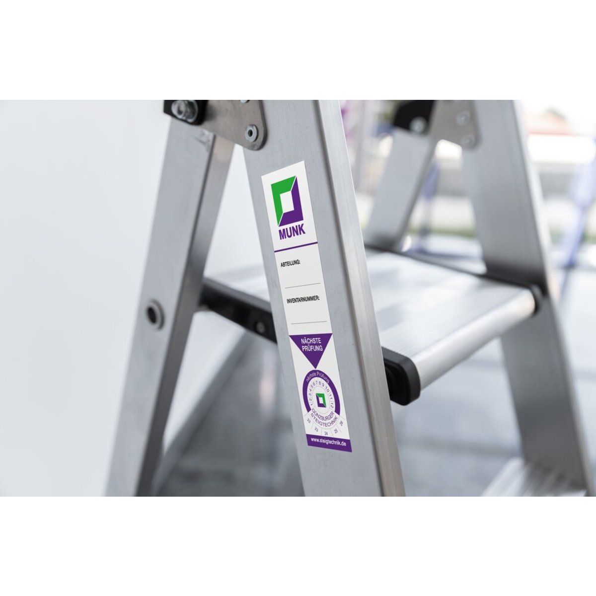 Zur einfachen und schnellen Kennzeichnung von Leitern, Gerüsten etc. Vorgedruckte Felder für Abteilung und Inventarnummer Integrierte Prüfplakette, die im Rahmen der wiederkehrend vorzunehmenden Prüfungen mit neuem Prüfdatum versehen oder überklebt werden kann 1 VE = 20 StückInformationen zu Nachhaltigkeitskriterien Unternehmenszertifizierung: ISO 9001 Unternehmenszertifizierung: EN 1090 Unternehmenszertifizierung: EcoVadis RoHS REACH Die MUNK Group arbeitet mit einem Code of Conduct Das Lieferkettengesetz findet aufgrund unserer Größe keine Anwendung Die verwendeten Materialien sind der technischen Spezifikation aufgeführt Ressourcenschonende Herstellung: eigene Photovoltaik-Anlagen Energieeffizienter Verbrauch bei der Herstellung: LED-Beleuchtung Reparaturfähigkeit, Langlebigkeit und Qualität: 15 Jahre Garantie auf Serienprodukte made in Germany Recyclingfähigkeit: Unsere Produkte …