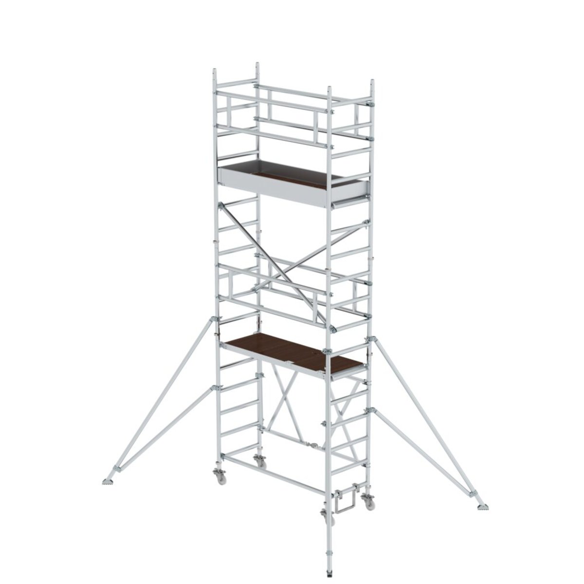 Rollgerüst aus stabilem Aluminium-Rundrohr mit geschweißten Rahmenteilen Klapprahmen aus Rechteckrohr-Holmen mit selbstarretierenden Scharnieren Platzsparend bei Transport und Lagerung Vier Lenkrollen Ø 125 mm mit zentrischer Lasteinleitung und Spindeln Trittsichere Plattform für festen Stand Aluminium Bordbretter und Geländerrahmen mit integrierter Knieleiste zur Absturzsicherung (ab Plattformhöhe 2,8 m) Einfacher Auf- und Abbau ohne Werkzeug Unterschiedliche Plattformbreiten erhältlich (0,75/1,35 m) Plattformlängen 2,45 m und 3,0 m auf Anfrage Arbeitshöhen bis 13,8 m GS-geprüft nach DIN EN 1004 Lastklasse/Gerüstgruppe 2: 1,5 kN/m² Um die Anforderungen der DIN EN 1004-1:2021 zu erfüllen, muss dieses Gerüst umgerüstet werden Möglichkeit 1 – Umrüstung auf MSG: 2 Montagesicherungsgeländer (Bestell-Nr. 027991) sind für einen sicheren Auf-, Ab- und Umbau erforderlich Möglichkeit 2 – Umrü…