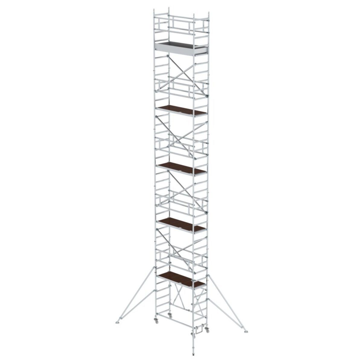 Rollgerüst aus stabilem Aluminium-Rundrohr mit geschweißten Rahmenteilen Klapprahmen aus Rechteckrohr-Holmen mit selbstarretierenden Scharnieren Platzsparend bei Transport und Lagerung Vier Lenkrollen Ø 125 mm mit zentrischer Lasteinleitung und Spindeln Trittsichere Plattform für festen Stand Aluminium Bordbretter und Geländerrahmen mit integrierter Knieleiste zur Absturzsicherung (ab Plattformhöhe 2,8 m) Einfacher Auf- und Abbau ohne Werkzeug Unterschiedliche Plattformbreiten erhältlich (0,75/1,35 m) Plattformlängen 2,45 m und 3,0 m auf Anfrage Arbeitshöhen bis 13,8 m GS-geprüft nach DIN EN 1004 Lastklasse/Gerüstgruppe 2: 1,5 kN/m² Um die Anforderungen der DIN EN 1004-1:2021 zu erfüllen, muss dieses Gerüst umgerüstet werden Möglichkeit 1 – Umrüstung auf MSG: 2 Montagesicherungsgeländer (Bestell-Nr. 027991) sind für einen sicheren Auf-, Ab- und Umbau erforderlich Möglichkeit 2 – Umrü…