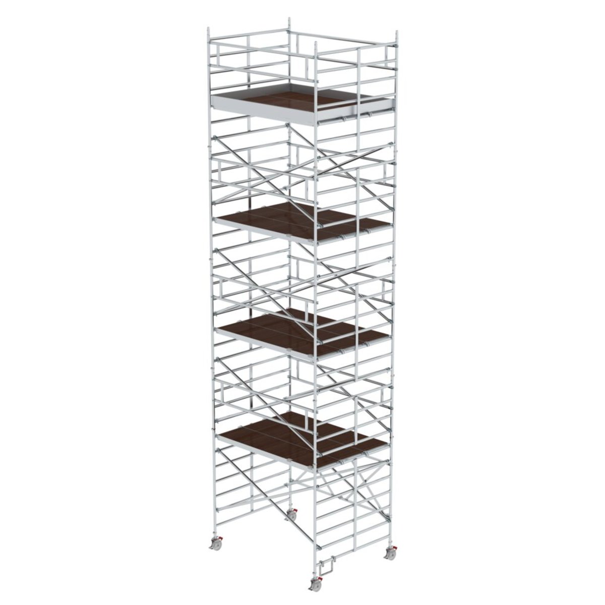 Rollgerüst aus stabilem Aluminium-Rundrohr mit geschweißten Rahmenteilen Doppel-Klapprahmen aus Rechteckrohr-Holmen mit selbstarretierenden Scharnieren Großformatige Arbeitsfläche mit 4,5 m² Platzsparend bei Transport und Lagerung Vier Lenkrollen Ø 200 mm mit zentrischer Lasteinleitung, Feststellern und Spindeln Aluminium-Bordbretter und Geländerrahmen mit integrierter Knieleiste zur Absturzsicherung Einfacher Auf- und Abbau ohne Werkzeug Arbeitshöhen bis 10,35 m GS-geprüft nach DIN EN 1004 Lastklasse/Gerüstgruppe 2: 1,5 kN/m² Um die Anforderungen der DIN EN 1004-1:2021 zu erfüllen, muss dieses Gerüst umgerüstet werden Möglichkeit 1 – Umrüstung auf MSG: 2 Montagesicherungsgeländer (Bestell-Nr. 027991) sind für einen sicheren Auf-, Ab- und Umbau erforderlich Möglichkeit 2 – Umrüstung auf SG: Die Geländer längs durch Sicherheits-Geländer Rollgerüst in der passenden Gerüstlänge ersetzen…