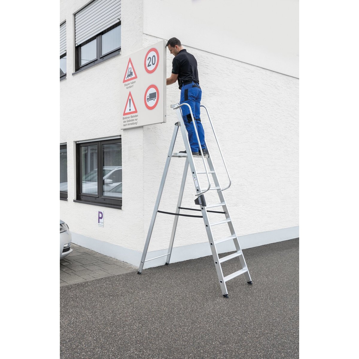 Plattformleiter aus Aluminium Stabile Rechteckrohr-Holme 80 mm tiefe, geriffelte Stufen Große, trapezförmige Plattform (400 / 360 x 425 mm) 4-fach gebördelte Stufen-/Holmverbindung Konische Holmführung für einen sicheren Stand Zwei Handläufe für sicheren Auf- und Abstieg (liegen lose bei) Leitergelenk ‘safe-cap’ ergo-pad® Griffzone mit Klemmmechanismus nivello® Leiterschuhe mit patentierter 2-Achsen-Neigungstechnik Praktische Ablageschale (350 x 200 mm) Spreizsicherung mit zwei hochfesten Polyestergurten Stufenabstand: 235 mm Leiterneigung: 70° Maximale Belastung: 150 kgInformationen zu Nachhaltigkeitskriterien Unternehmenszertifizierung: ISO 9001 Unternehmenszertifizierung: EN 1090 Unternehmenszertifizierung: EcoVadis RoHS REACH Die MUNK Group arbeitet mit einem Code of Conduct Das Lieferkettengesetz findet aufgrund unserer Größe keine Anwendung Die verwendeten Materialien sind der …