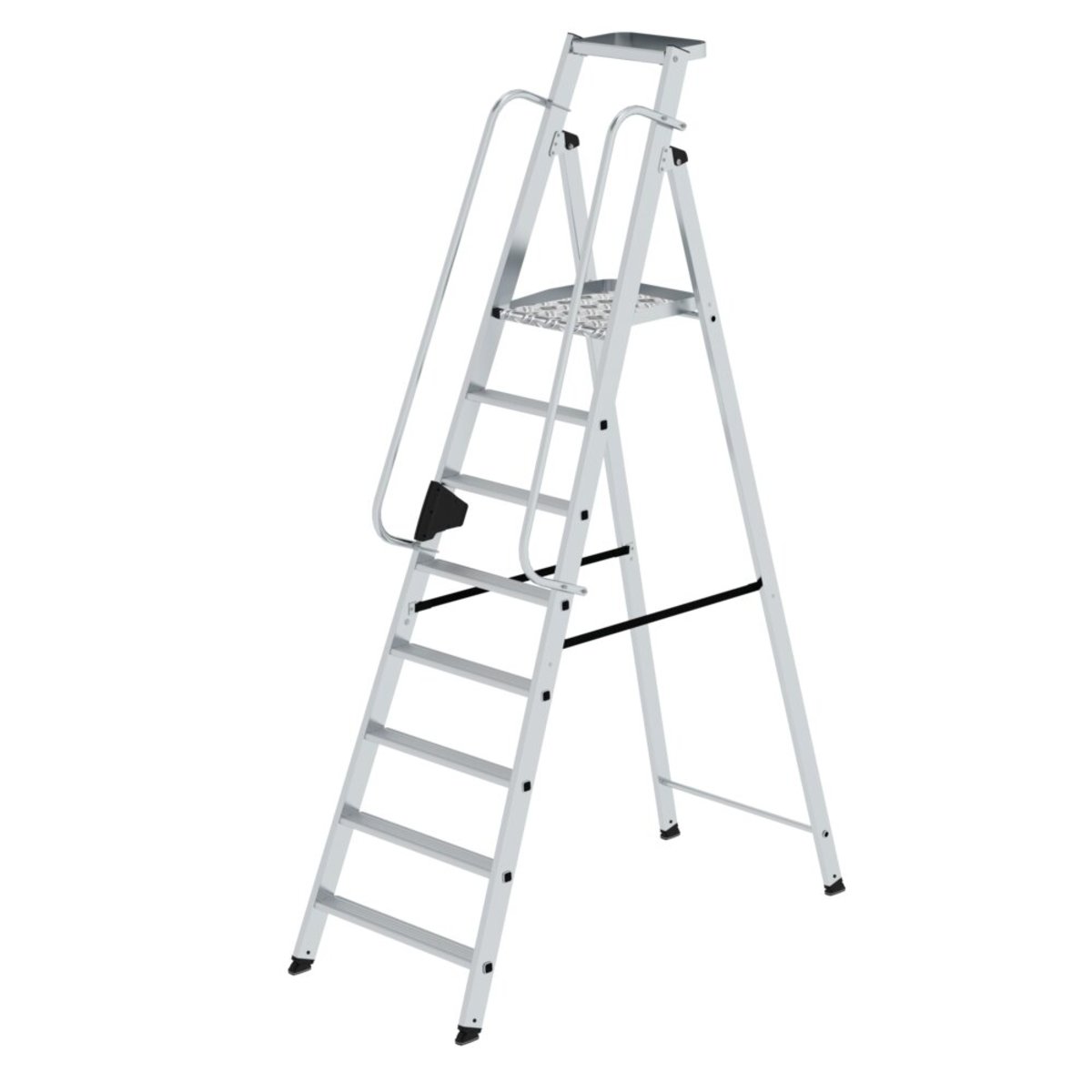 Plattformleiter aus Aluminium Stabile Rechteckrohr-Holme 80 mm tiefe, geriffelte Stufen Große, trapezförmige Plattform (400 / 360 x 425 mm) 4-fach gebördelte Stufen-/Holmverbindung Konische Holmführung für einen sicheren Stand Zwei Handläufe für sicheren Auf- und Abstieg (liegen lose bei) Leitergelenk ‘safe-cap’ ergo-pad® Griffzone mit Klemmmechanismus nivello® Leiterschuhe mit patentierter 2-Achsen-Neigungstechnik Praktische Ablageschale (350 x 200 mm) Spreizsicherung mit zwei hochfesten Polyestergurten Stufenabstand: 235 mm Leiterneigung: 70° Maximale Belastung: 150 kgInformationen zu Nachhaltigkeitskriterien Unternehmenszertifizierung: ISO 9001 Unternehmenszertifizierung: EN 1090 Unternehmenszertifizierung: EcoVadis RoHS REACH Die MUNK Group arbeitet mit einem Code of Conduct Das Lieferkettengesetz findet aufgrund unserer Größe keine Anwendung Die verwendeten Materialien sind der …