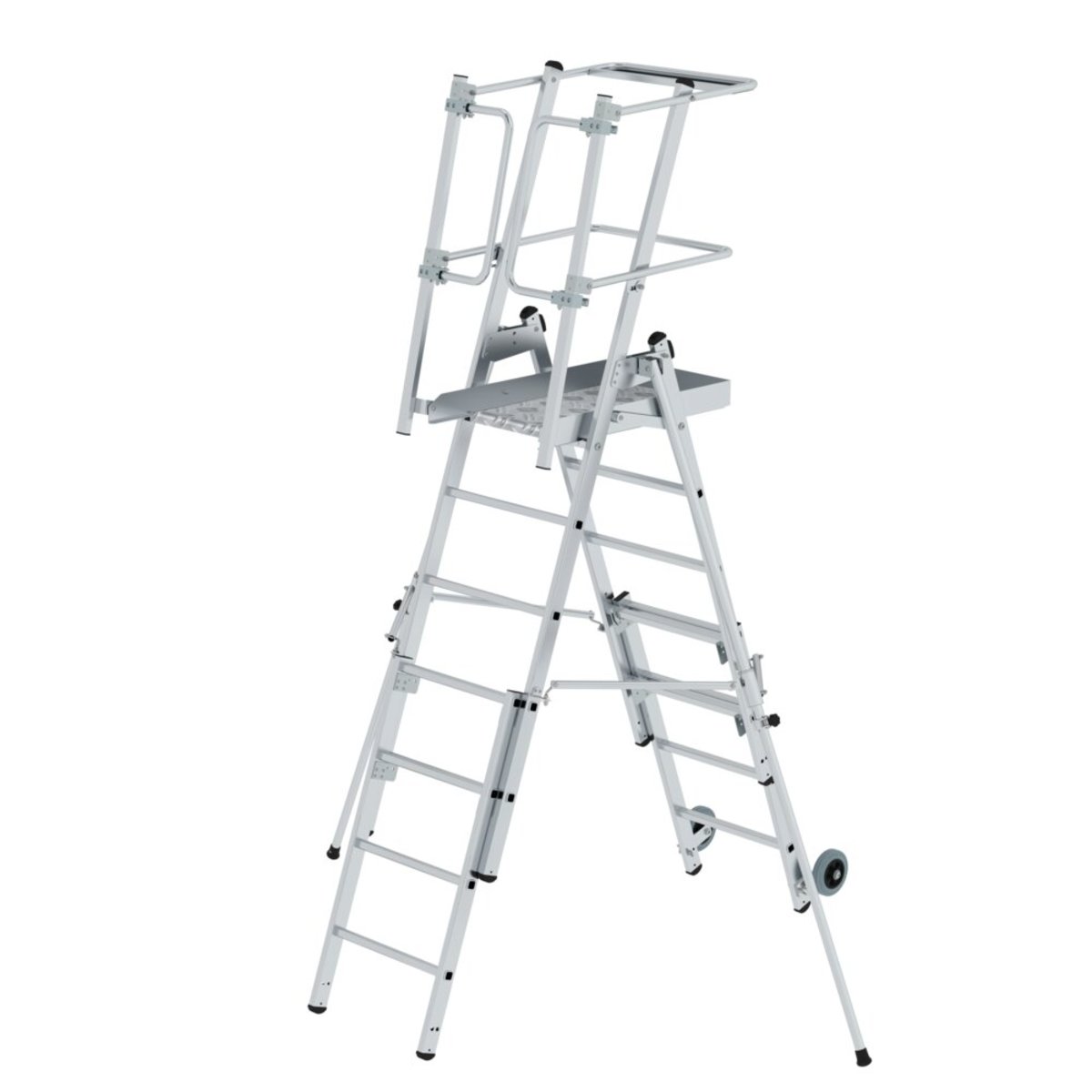 Plattformleiter aus Aluminium Stabile Rechteckrohr-Holme Beidseitig geriffelte Vierkantsprossen 30 x 30 mm Geräumige Plattform aus geriffeltem Aluminium-Warzenblech 480 x 655 mm 4-fach gebördelte Sprossen-/Holmverbindung Mit beidseitigem Handlauf, 3-seitigem, 1.000 mm hohem Geländer mit Knie- und Fußleisten Beidseitig stufenlos verstellbare Ausleger Selbstschließende Sicherheitstüre Großzügige Werkzeugablageschale Integrierte Rollen Ø150 mm und praktikabler Klappmechanismus für einen schnellen Standortwechsel Ausführung nach DIN EN 131-7 und der französischen Normen NFP 93-352/353 Mittels werkzeuglos montierbarem Teleskopaufsatz höhenverstellbar und treppengängig Maximale Belastung: 150 kgInformationen zu Nachhaltigkeitskriterien Unternehmenszertifizierung: ISO 9001 Unternehmenszertifizierung: EN 1090 Unternehmenszertifizierung: EcoVadis RoHS REACH Die MUNK Group arbeitet mit einem C…