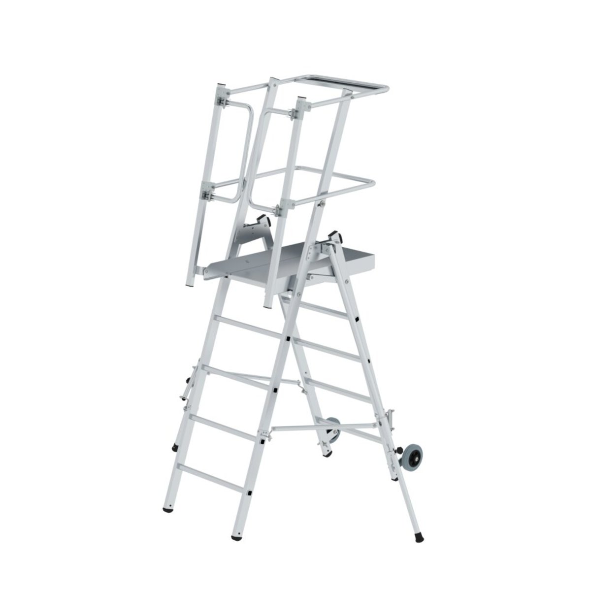 Plattformleiter aus Aluminium Stabile Rechteckrohr-Holme Beidseitig geriffelte Vierkantsprossen 30 x 30 mm Geräumige Plattform aus geriffeltem Aluminium-Warzenblech 480 x 655 mm 4-fach gebördelte Sprossen-/Holmverbindung Mit beidseitigem Handlauf, 3-seitigem, 1.000 mm hohem Geländer mit Knie- und Fußleisten Beidseitig stufenlos verstellbare Ausleger Selbstschließende Sicherheitstüre Großzügige Werkzeugablageschale Zwei Rollen Ø150 mm und praktikabler Klappmechanismus für einen schnellen Standortwechsel Mit und ohne flexiblem Teleskopaufsatz zum Einstecken erhältlich Ausführung nach DIN EN 131-7 und der französischen Normen NFP 93-352/353 Maximale Belastung: 150 kgInformationen zu Nachhaltigkeitskriterien Unternehmenszertifizierung: ISO 9001 Unternehmenszertifizierung: EN 1090 Unternehmenszertifizierung: EcoVadis RoHS REACH Die MUNK Group arbeitet mit einem Code of Conduct Das Lieferk…