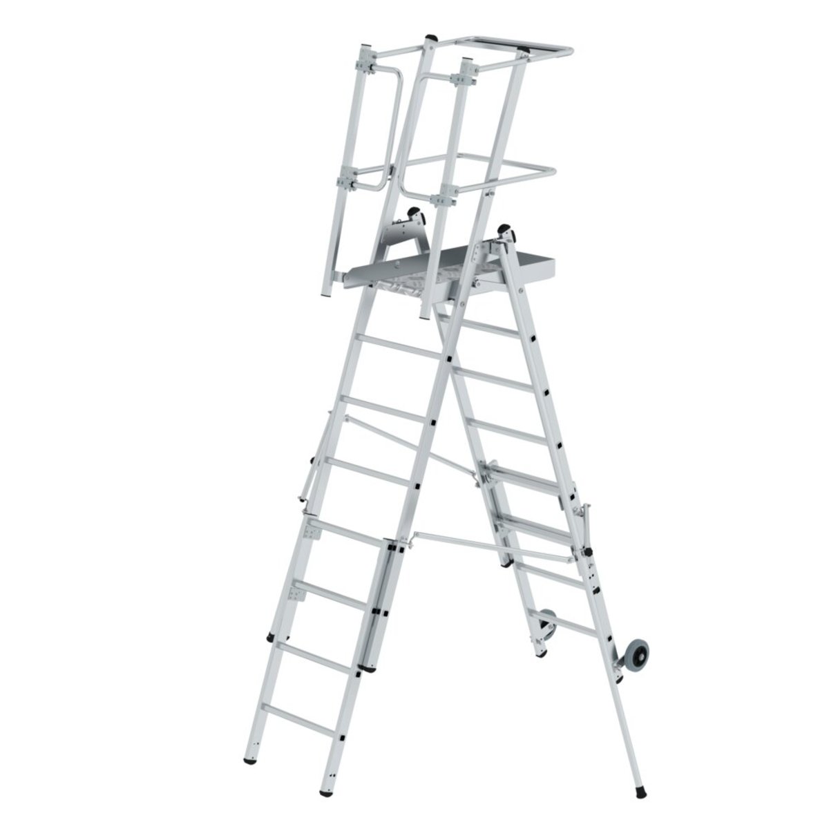 Plattformleiter aus Aluminium Stabile Rechteckrohr-Holme Beidseitig geriffelte Vierkantsprossen 30 x 30 mm Geräumige Plattform aus geriffeltem Aluminium-Warzenblech 480 x 655 mm 4-fach gebördelte Sprossen-/Holmverbindung Mit beidseitigem Handlauf, 3-seitigem, 1.000 mm hohem Geländer mit Knie- und Fußleisten Beidseitig stufenlos verstellbare Ausleger Selbstschließende Sicherheitstüre Großzügige Werkzeugablageschale Integrierte Rollen Ø150 mm und praktikabler Klappmechanismus für einen schnellen Standortwechsel Ausführung nach DIN EN 131-7 und der französischen Normen NFP 93-352/353 Mittels werkzeuglos montierbarem Teleskopaufsatz höhenverstellbar und treppengängig Maximale Belastung: 150 kgInformationen zu Nachhaltigkeitskriterien Unternehmenszertifizierung: ISO 9001 Unternehmenszertifizierung: EN 1090 Unternehmenszertifizierung: EcoVadis RoHS REACH Die MUNK Group arbeitet mit einem C…