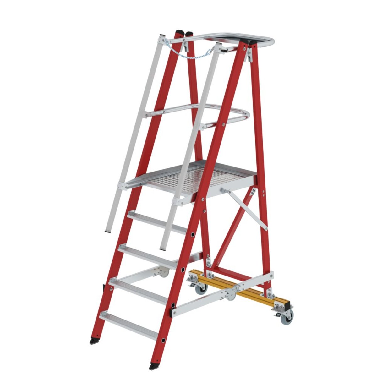 Plattformleiter aus GFK/Alu Holme aus glasfaserverstärkten Rechteckrohr-Profilen (mind. 10 Jahre Alterungsbeständigkeit) 80 mm tiefe, geriffelte Stufen aus Aluminium 4-fach gebördelte Stufen-/Holmverbindung Geräumige Plattform aus GFK Gitterrost (650 x 600 mm) Mit beidseitigem Handlauf, 3-seitigem, 1.000 mm hohem Geländer mit Knie- und Fußleisten sowie Sicherungsseil nivello® Leiterschuhe mit patentierter 2-Achsen-Neigungstechnik Stützteil mit schmaler Quertraverse und Bockrollen Ø125 mm mit Feststeller für einen schnellen Standortwechsel im ausgeklappten Zustand Dank stabiler Stahl-Scharniere platzsparend zusammenklappbar Großzügige Werkzeugablageschale Stufenabstand: 235 mm Geprüft bis 1.000 Volt nach DIN EN 61478:2002 Abschnitt 6.5.1 und A1:2004 Kategorie 1 (entspricht europäischer Norm DIN EN 131-7) Leiterneigung: 70° Maximale Belastung: 150 kg Lieferzeit: 15 Tage Geeignet für da…