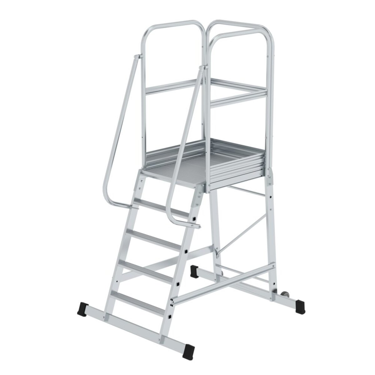 Plattformleiter aus Aluminium Stabile Rechteckrohr-Holme 80 mm tiefe, geriffelte Stufen Geräumige Plattform mit Riffelung für sicheren Stand (800 x 650 mm) 4-fach gebördelte Stufen-/Holmverbindung Mit beidseitigem Handlauf, 3-seitigem, 1.000 mm hohem Geländer mit Knie- und Fußleisten Zwei Rollen Ø100 mm für ein leichtes Verfahren von Ort zu Ort Einfache Montage (Versand erfolgt zerlegt) Quertraversen für hohe Standsicherheit Außenbreite: 650 mm (ohne Traverse) Leiterneigung: 70° Maximale Belastung: 150 kgInformationen zu Nachhaltigkeitskriterien Unternehmenszertifizierung: ISO 9001 Unternehmenszertifizierung: EN 1090 Unternehmenszertifizierung: EcoVadis RoHS REACH Die MUNK Group arbeitet mit einem Code of Conduct Das Lieferkettengesetz findet aufgrund unserer Größe keine Anwendung Die verwendeten Materialien sind der technischen Spezifikation aufgeführt Ressourcenschonende Herstellun…