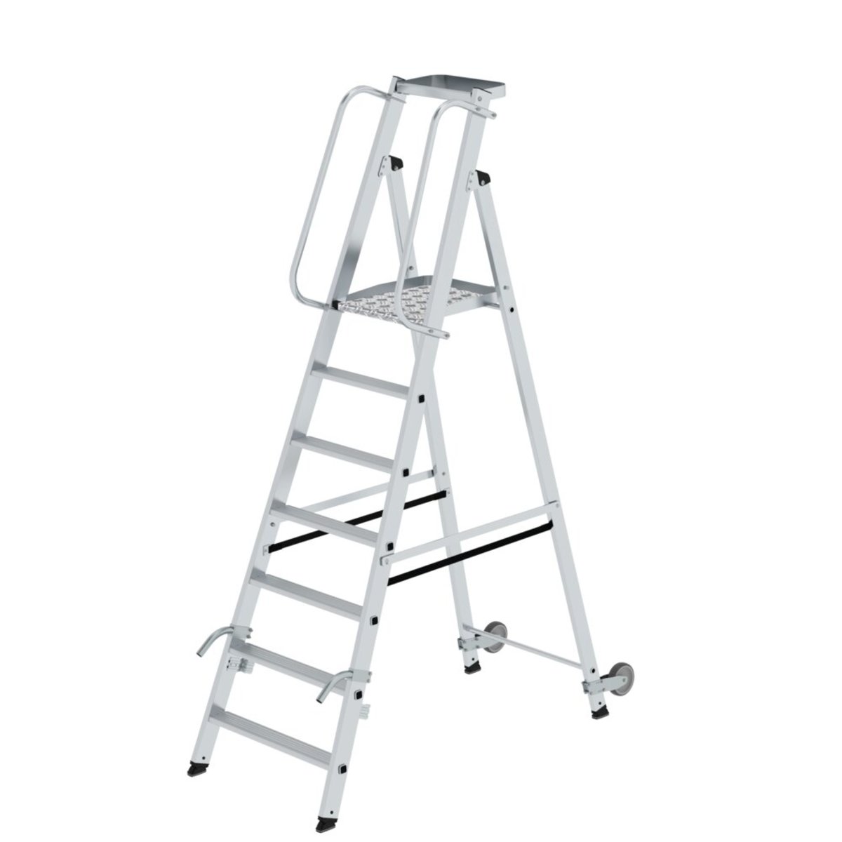 Plattformleiter aus Aluminium Stabile Rechteckrohr-Holme 80 mm tiefe, geriffelte Stufen Große, trapezförmige Plattform (400 / 360 x 425 mm) 4-fach gebördelte Stufen-/Holmverbindung Konische Holmführung für einen sicheren Stand Zwei Handläufe für sicheren Auf- und Abstieg (liegen lose bei) Leitergelenk ‘safe-cap’ nivello® Leiterschuhe mit patentierter 2-Achsen-Neigungstechnik Praktische Ablageschale (350 x 200 mm) Starre Verbindung durch beidseitig lösbare Metallstreben Spreizsicherung mit zwei hochfesten Polyestergurten Zwei Hubrollen Ø 125 mm und Handgriffe (liegen lose bei) Stufenabstand: 235 mm Leiterneigung: 70° Maximale Belastung: 150 kgInformationen zu Nachhaltigkeitskriterien Unternehmenszertifizierung: ISO 9001 Unternehmenszertifizierung: EN 1090 Unternehmenszertifizierung: EcoVadis RoHS REACH Die MUNK Group arbeitet mit einem Code of Conduct Das Lieferkettengesetz findet auf…