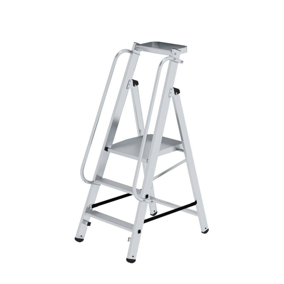 Plattformleiter aus Aluminium 80 mm tiefe, geriffelte Stufen 4-fach gebördelte Stufen-/Holmverbindung Große, trapezförmige Plattform (400 / 360 x 425 mm) Mit optionalen Einsteckteilen flexibel erweiterbar Leitergelenk ‘safe-cap’ Praktische Ablageschale (350 x 200 mm) Spreizsicherung mit zwei hochfesten Polyestergurten Zwei Handläufe für sicheren Auf- und Abstieg (liegen lose bei) Farbige Beschichtung der Holme zur leichten Zuordnung der Paare Platzsparend bei Transport und Lagerung Optional mit Trittauflagen clip-step, clip-step R13 und clip-step relax ausrüstbar Stufenabstand: 235 mm Maximale Belastung: 150 kgInformationen zu Nachhaltigkeitskriterien Unternehmenszertifizierung: ISO 9001 Unternehmenszertifizierung: EN 1090 Unternehmenszertifizierung: EcoVadis RoHS REACH Die MUNK Group arbeitet mit einem Code of Conduct Das Lieferkettengesetz findet aufgrund unserer Größe keine Anwend…