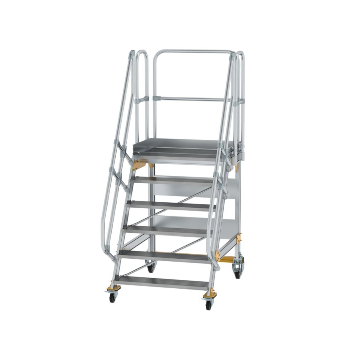 Fahrbare Plattformtreppe aus Aluminium mit Neigung 60° Stufen- und Plattformbreite: 1.000 mm Plattformlänge: 460 mm Letzte Stufe (Tiefe: 225 mm) auf gleicher Höhe wie Plattform montiert (Gesamttrittfläche: 685 mm) Stufen- und Plattformausführung standardmäßig in Aluminium geriffelt (R 9), optional auch mit anderen Belägen erhältlich Handlauf beidseitig und 3-seitiges Plattformgeländer Ø 40 mm mit verschraubten Verbindungselementen serienmäßig (Geländerhöhe: 1.100 mm) Zwei Lenkrollen Ø 100 mm am Steigteil und zwei Bockrollen Ø 125 mm als Querfahrwerk am Stützteil garantieren ein einfaches Verfahren von Ort zu Ort, die integrierten Feststeller (Totalstop) sorgen für einen sicheren Stand Einfache Montage durch Lieferung in vormontierten Baugruppen inklusive Montageanleitung Maximale Belastung: 1,5 kN/m2, Stufenbelastung 150 kg, Gesamtbelastung 300 kg Hinweis: Im Standard sind Verbindung…