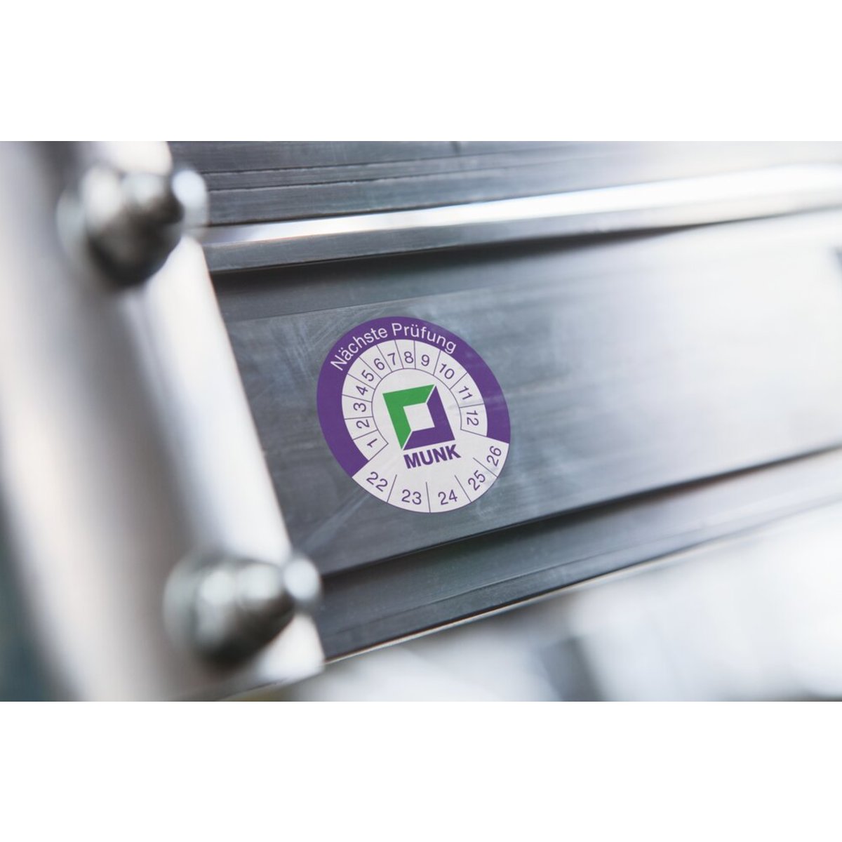Die Prüfplakette befindet sich bei Auslieferung serienmäßig auf den meisten Produkten Im Rahmen der wiederkehrend vorzunehmenden Prüfungen kann diese mit neuem Prüfdatum überklebt werden 1 VE = 50 StückInformationen zu Nachhaltigkeitskriterien Unternehmenszertifizierung: ISO 9001 Unternehmenszertifizierung: EN 1090 Unternehmenszertifizierung: EcoVadis RoHS REACH Die MUNK Group arbeitet mit einem Code of Conduct Das Lieferkettengesetz findet aufgrund unserer Größe keine Anwendung Die verwendeten Materialien sind der technischen Spezifikation aufgeführt Ressourcenschonende Herstellung: eigene Photovoltaik-Anlagen Energieeffizienter Verbrauch bei der Herstellung: LED-Beleuchtung Reparaturfähigkeit, Langlebigkeit und Qualität: 15 Jahre Garantie auf Serienprodukte made in Germany Recyclingfähigkeit: Unsere Produkte bestehen zum größten Teil aus Aluminium, Stahl oder Holz und können direkt…