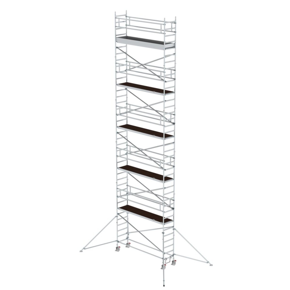 Rollgerüst aus stabilem Aluminium-Rundrohr mit geschweißten Rahmenteilen Alle Gerüstteile sind auch einzeln als Ersatz- oder Erweiterungsteile erhältlich Stabil und flexibel durch klappbare Ausleger Ideal auch für den wandseitigen Aufbau oder das Verfahren in engen Gängen Vier Lenkrollen Ø 200 mm mit zentrischer Lasteinleitung, Feststellern und Spindeln Aluminium-Bordbretter und Geländerrahmen mit integrierter Knieleiste zur Absturzsicherung Werkzeugloser Auf- und Abbau dank Steckverbindungen und Schnellverschlüssen Geringes Gewicht der Einzelteile für ein einfaches Handling Unterschiedliche Plattformlängen erhältlich (1,80 / 2,45 / 3,0 m) Arbeitshöhen bis 12,35 m GS-geprüft nach DIN EN 1004 Lastklasse/Gerüstgruppe 3: 2,0 kN/m²Informationen zu Nachhaltigkeitskriterien Unternehmenszertifizierung: ISO 9001 Unternehmenszertifizierung: EN 1090 Unternehmenszertifizierung: EcoVadis RoHS RE…