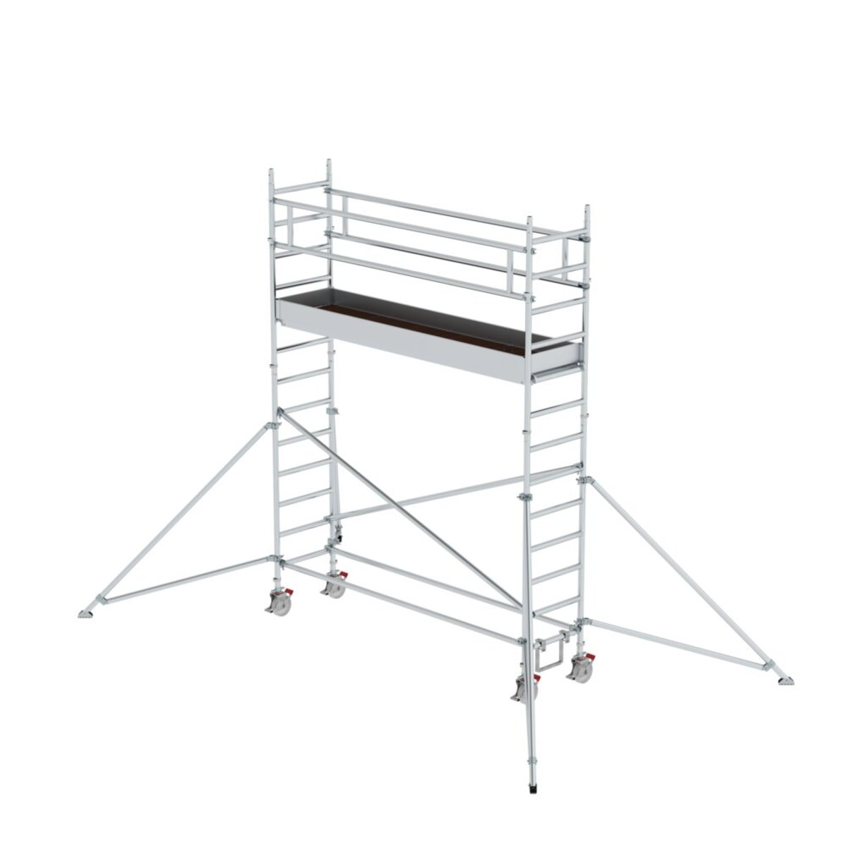 Rollgerüst aus stabilem Aluminium-Rundrohr mit geschweißten Rahmenteilen Alle Gerüstteile sind auch einzeln als Ersatz- oder Erweiterungsteile erhältlich Stabil und flexibel durch klappbare Ausleger Ideal auch für den wandseitigen Aufbau oder das Verfahren in engen Gängen Vier Lenkrollen Ø 200 mm mit zentrischer Lasteinleitung, Feststellern und Spindeln Aluminium-Bordbretter und Geländerrahmen mit integrierter Knieleiste zur Absturzsicherung Werkzeugloser Auf- und Abbau dank Steckverbindungen und Schnellverschlüssen Geringes Gewicht der Einzelteile für ein einfaches Handling Unterschiedliche Plattformlängen erhältlich (1,80 / 2,45 / 3,0 m) Arbeitshöhen bis 12,35 m GS-geprüft nach DIN EN 1004 Lastklasse/Gerüstgruppe 3: 2,0 kN/m²Informationen zu Nachhaltigkeitskriterien Unternehmenszertifizierung: ISO 9001 Unternehmenszertifizierung: EN 1090 Unternehmenszertifizierung: EcoVadis RoHS RE…