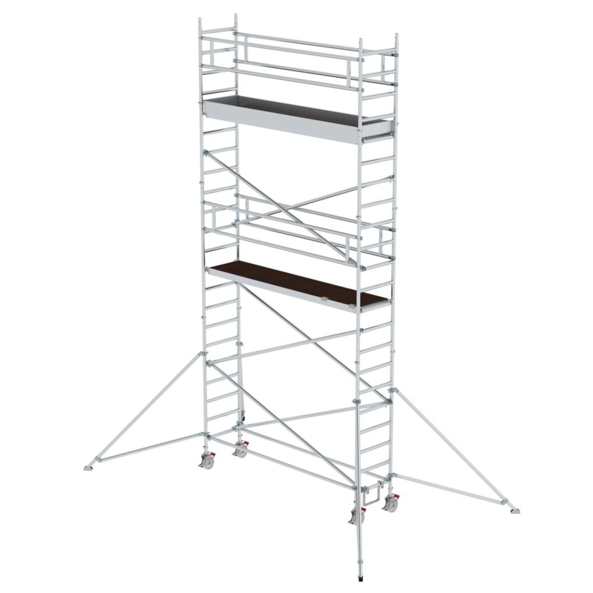 Rollgerüst aus stabilem Aluminium-Rundrohr mit geschweißten Rahmenteilen Alle Gerüstteile sind auch einzeln als Ersatz- oder Erweiterungsteile erhältlich Stabil und flexibel durch klappbare Ausleger Ideal auch für den wandseitigen Aufbau oder das Verfahren in engen Gängen Vier Lenkrollen Ø 200 mm mit zentrischer Lasteinleitung, Feststellern und Spindeln Aluminium-Bordbretter und Geländerrahmen mit integrierter Knieleiste zur Absturzsicherung Werkzeugloser Auf- und Abbau dank Steckverbindungen und Schnellverschlüssen Geringes Gewicht der Einzelteile für ein einfaches Handling Unterschiedliche Plattformlängen erhältlich (1,80 / 2,45 / 3,0 m) Arbeitshöhen bis 12,35 m GS-geprüft nach DIN EN 1004 Lastklasse/Gerüstgruppe 3: 2,0 kN/m²Informationen zu Nachhaltigkeitskriterien Unternehmenszertifizierung: ISO 9001 Unternehmenszertifizierung: EN 1090 Unternehmenszertifizierung: EcoVadis RoHS RE…