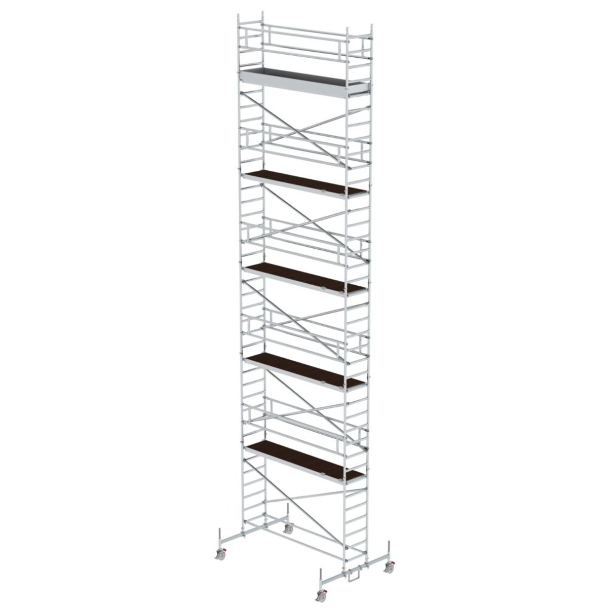 Rollgerüst aus stabilem Aluminium-Rundrohr mit geschweißten Rahmenteilen Alle Gerüstteile sind auch einzeln als Ersatz- oder Erweiterungsteile erhältlich Fahrbalken aus verzinktem Stahl zum flexiblen Wechsel der Arbeitsposition (Ort/Aufbau) Vier Lenkrollen Ø 200 mm mit zentrischer Lasteinleitung, Feststellern und Spindeln Einfaches Verschieben des Gerüstes auf dem Fahrbalken durch Lösen von acht Schrauben Mittiger und seitlicher Aufbau möglich Aluminium-Bordbretter und Geländerrahmen mit integrierter Knieleiste zur Absturzsicherung Werkzeugloser Auf- und Abbau von Plattform zu Plattform dank Steckverbindungen und Schnellverschlüssen Geringes Gewicht der Einzelteile für ein einfaches Handling Unterschiedliche Plattformlängen erhältlich (1,80 / 2,45 / 3,0 m) Arbeitshöhen bis 12,45 m GS-geprüft nach DIN EN 1004 Lastklasse/Gerüstgruppe 3: 2,0 kN/m² Um die Anforderungen der DIN EN 1004-1:…