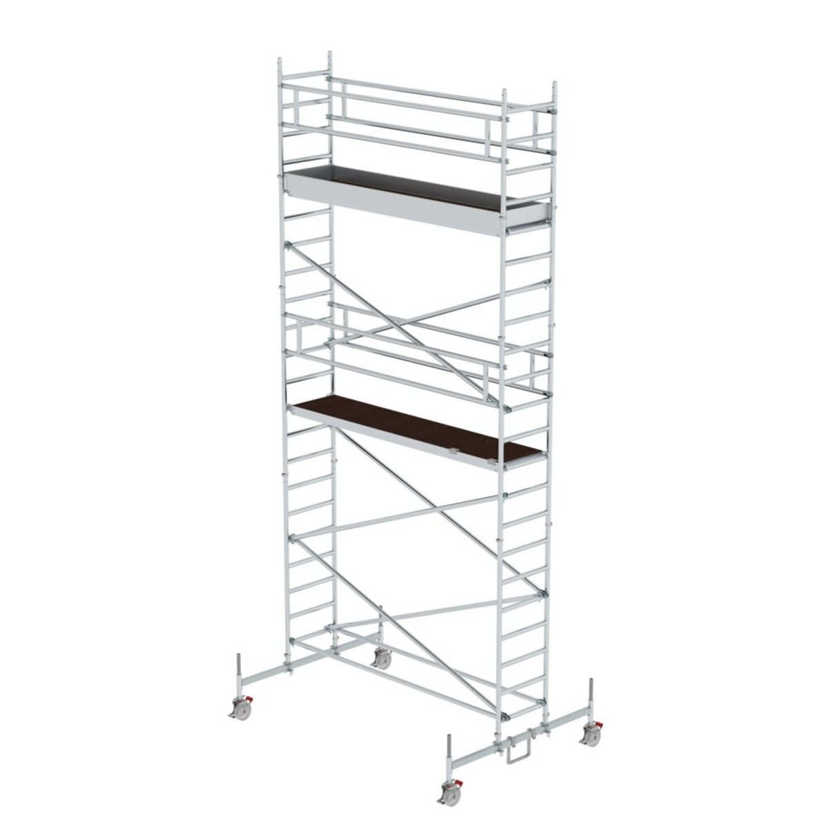Rollgerüst aus stabilem Aluminium-Rundrohr mit geschweißten Rahmenteilen Alle Gerüstteile sind auch einzeln als Ersatz- oder Erweiterungsteile erhältlich Fahrbalken aus verzinktem Stahl zum flexiblen Wechsel der Arbeitsposition (Ort/Aufbau) Vier Lenkrollen Ø 200 mm mit zentrischer Lasteinleitung, Feststellern und Spindeln Einfaches Verschieben des Gerüstes auf dem Fahrbalken durch Lösen von acht Schrauben Mittiger und seitlicher Aufbau möglich Aluminium-Bordbretter und Geländerrahmen mit integrierter Knieleiste zur Absturzsicherung Werkzeugloser Auf- und Abbau von Plattform zu Plattform dank Steckverbindungen und Schnellverschlüssen Geringes Gewicht der Einzelteile für ein einfaches Handling Unterschiedliche Plattformlängen erhältlich (1,80 / 2,45 / 3,0 m) Arbeitshöhen bis 12,45 m GS-geprüft nach DIN EN 1004 Lastklasse/Gerüstgruppe 3: 2,0 kN/m² Um die Anforderungen der DIN EN 1004-1:…