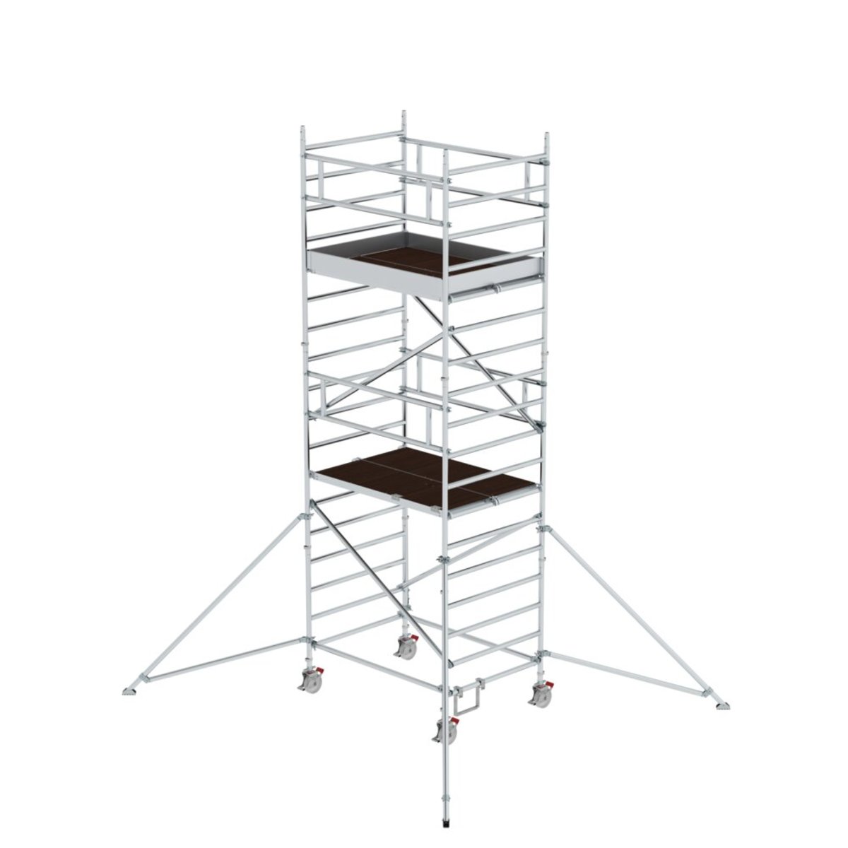 Rollgerüst aus stabilem Aluminium-Rundrohr mit geschweißten Rahmenteilen Alle Gerüstteile sind auch einzeln als Ersatz- oder Erweiterungsteile erhältlich Stabil und flexibel durch klappbare Ausleger Ideal auch für den wandseitigen Aufbau oder das Verfahren in engen Gängen Vier Lenkrollen Ø 200 mm mit zentrischer Lasteinleitung, Feststellern und Spindeln Großformatige Arbeitsfläche mit 1,35 m Breite Aluminium-Bordbretter und Geländerrahmen mit integrierter Knieleiste zur Absturzsicherung Werkzeugloser Auf- und Abbau dank Steckverbindungen und Schnellverschlüssen Geringes Gewicht der Einzelteile für ein einfaches Handling Unterschiedliche Plattformlängen erhältlich (1,80 / 2,45 / 3,0 m) Arbeitshöhen bis 13,35 m GS-geprüft nach DIN EN 1004 Lastklasse/Gerüstgruppe 3: 2,0 kN/m² Um die Anforderungen der DIN EN 1004-1:2021 zu erfüllen, muss dieses Gerüst umgerüstet werden Möglichkeit 1 – Um…