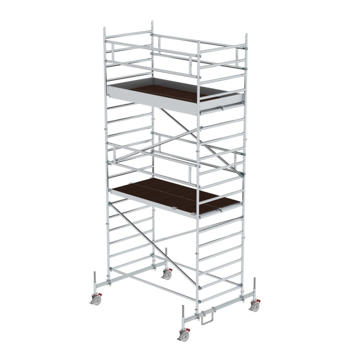 Rollgerüst aus stabilem Aluminium-Rundrohr mit geschweißten Rahmenteilen Großformatige Arbeitsfläche mit 1,35 m Breite Alle Gerüstteile sind auch einzeln als Ersatz- oder Erweiterungsteile erhältlich Fahrbalken aus verzinktem Stahl zum flexiblen Wechsel der Arbeitsposition (Ort/Aufbau) Vier Lenkrollen Ø 200 mm mit zentrischer Lasteinleitung, Feststellern und Spindeln Einfaches Verschieben des Gerüstes auf dem Fahrbalken durch Lösen von acht Schrauben Mittiger und seitlicher Aufbau möglich Aluminium-Bordbretter und Geländerrahmen mit integrierter Knieleiste zur Absturzsicherung Werkzeugloser Auf- und Abbau dank Steckverbindungen und Schnellverschlüssen Geringes Gewicht der Einzelteile für ein einfaches Handling Unterschiedliche Plattformlängen erhältlich (1,80 / 2,45 / 3,0 m) Arbeitshöhen bis 13,45 m GS-geprüft nach DIN EN 1004 Lastklasse/Gerüstgruppe 3: 2,0 kN/m² Um die Anforderungen…