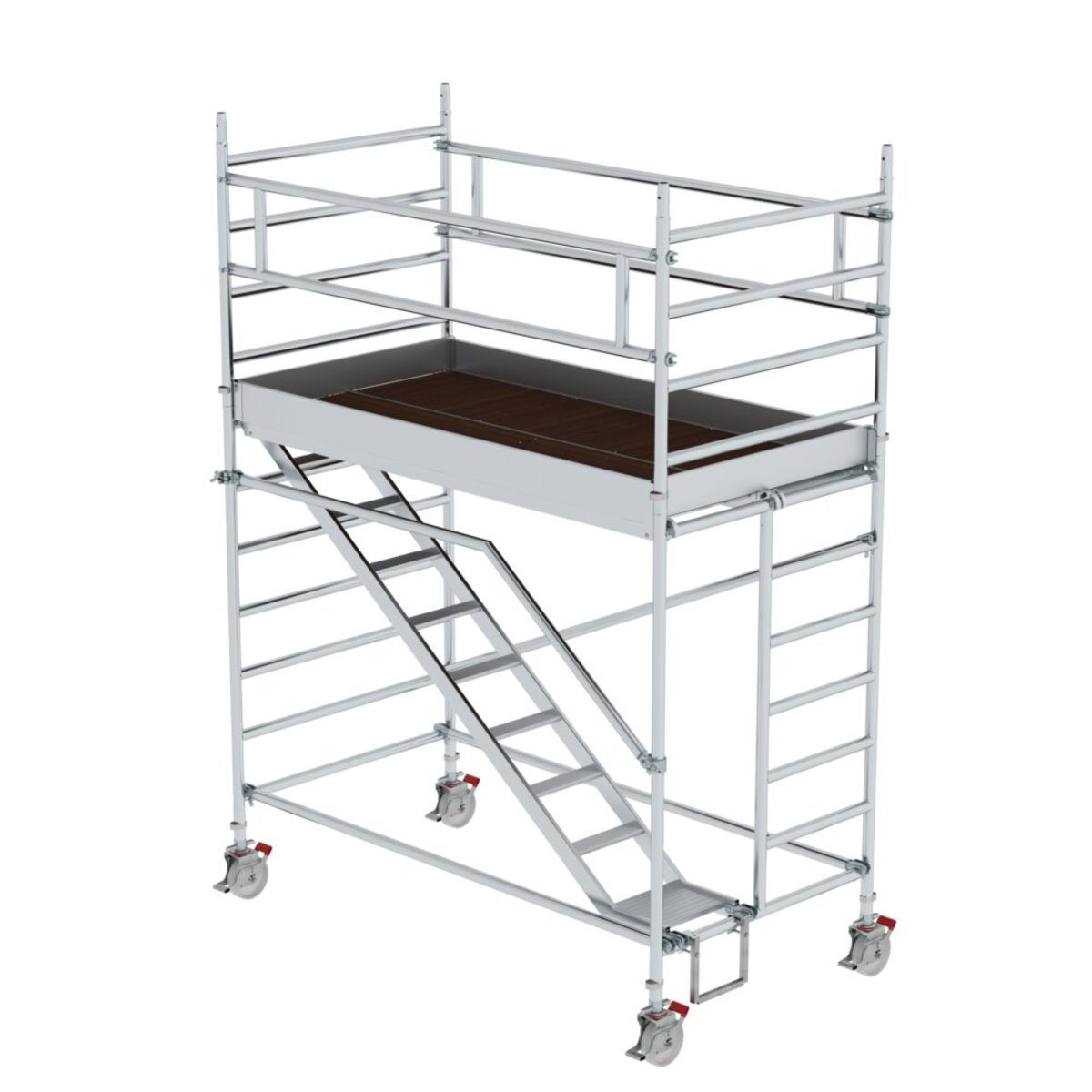 Rollgerüst aus stabilem Aluminium-Rundrohr mit geschweißten Rahmenteilen Schrägaufstiege von Plattform zu Plattform mit 100 mm tiefen, geriffelten Aluminiumstufen und Handlauf für den sicheren Auf- und Abstieg Alle Gerüstteile sind auch einzeln als Ersatz- oder Erweiterungsteile erhältlich Ideal auch für den wandseitigen Aufbau oder das Verfahren in engen Gängen Zugang durch Öffnung im Einstiegsrahmen Vier Lenkrollen Ø 200 mm mit zentrischer Lasteinleitung, Feststellern und Spindeln Großformatige Arbeitsfläche mit 1,35 m Breite Aluminium-Bordbretter und Geländerrahmen mit integrierter Knieleiste zur Absturzsicherung Werkzeugloser Auf- und Abbau von Plattform zu Plattform dank Steckverbindungen und Schnellverschlüssen Geringes Gewicht der Einzelteile für ein einfaches Handling Unterschiedliche Plattformlängen erhältlich (1,80 / 2,45 / 3,0 m) Arbeitshöhen bis 12,35 m GS-geprüft nach DI…