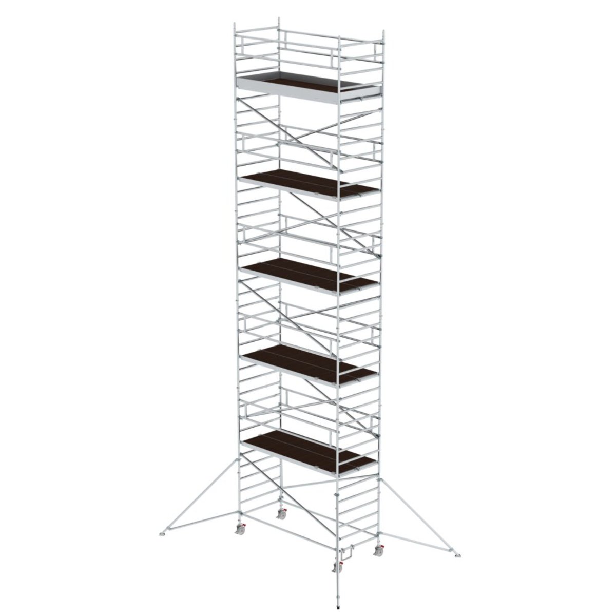 Rollgerüst aus stabilem Aluminium-Rundrohr mit geschweißten Rahmenteilen Alle Gerüstteile sind auch einzeln als Ersatz- oder Erweiterungsteile erhältlich Stabil und flexibel durch klappbare Ausleger Ideal auch für den wandseitigen Aufbau oder das Verfahren in engen Gängen Vier Lenkrollen Ø 200 mm mit zentrischer Lasteinleitung, Feststellern und Spindeln Großformatige Arbeitsfläche mit 1,35 m Breite Aluminium-Bordbretter und Geländerrahmen mit integrierter Knieleiste zur Absturzsicherung Werkzeugloser Auf- und Abbau dank Steckverbindungen und Schnellverschlüssen Geringes Gewicht der Einzelteile für ein einfaches Handling Unterschiedliche Plattformlängen erhältlich (1,80 / 2,45 / 3,0 m) Arbeitshöhen bis 13,35 m GS-geprüft nach DIN EN 1004 Lastklasse/Gerüstgruppe 3: 2,0 kN/m² Um die Anforderungen der DIN EN 1004-1:2021 zu erfüllen, muss dieses Gerüst umgerüstet werden Möglichkeit 1 – Um…