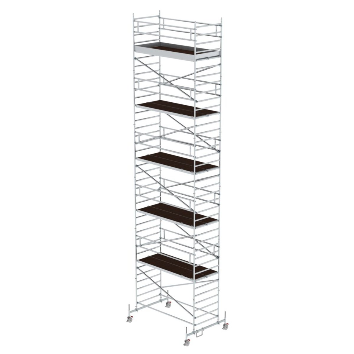 Rollgerüst aus stabilem Aluminium-Rundrohr mit geschweißten Rahmenteilen Großformatige Arbeitsfläche mit 1,35 m Breite Alle Gerüstteile sind auch einzeln als Ersatz- oder Erweiterungsteile erhältlich Fahrbalken aus verzinktem Stahl zum flexiblen Wechsel der Arbeitsposition (Ort/Aufbau) Vier Lenkrollen Ø 200 mm mit zentrischer Lasteinleitung, Feststellern und Spindeln Einfaches Verschieben des Gerüstes auf dem Fahrbalken durch Lösen von acht Schrauben Mittiger und seitlicher Aufbau möglich Aluminium-Bordbretter und Geländerrahmen mit integrierter Knieleiste zur Absturzsicherung Werkzeugloser Auf- und Abbau dank Steckverbindungen und Schnellverschlüssen Geringes Gewicht der Einzelteile für ein einfaches Handling Unterschiedliche Plattformlängen erhältlich (1,80 / 2,45 / 3,0 m) Arbeitshöhen bis 13,45 m GS-geprüft nach DIN EN 1004 Lastklasse/Gerüstgruppe 3: 2,0 kN/m² Um die Anforderungen…