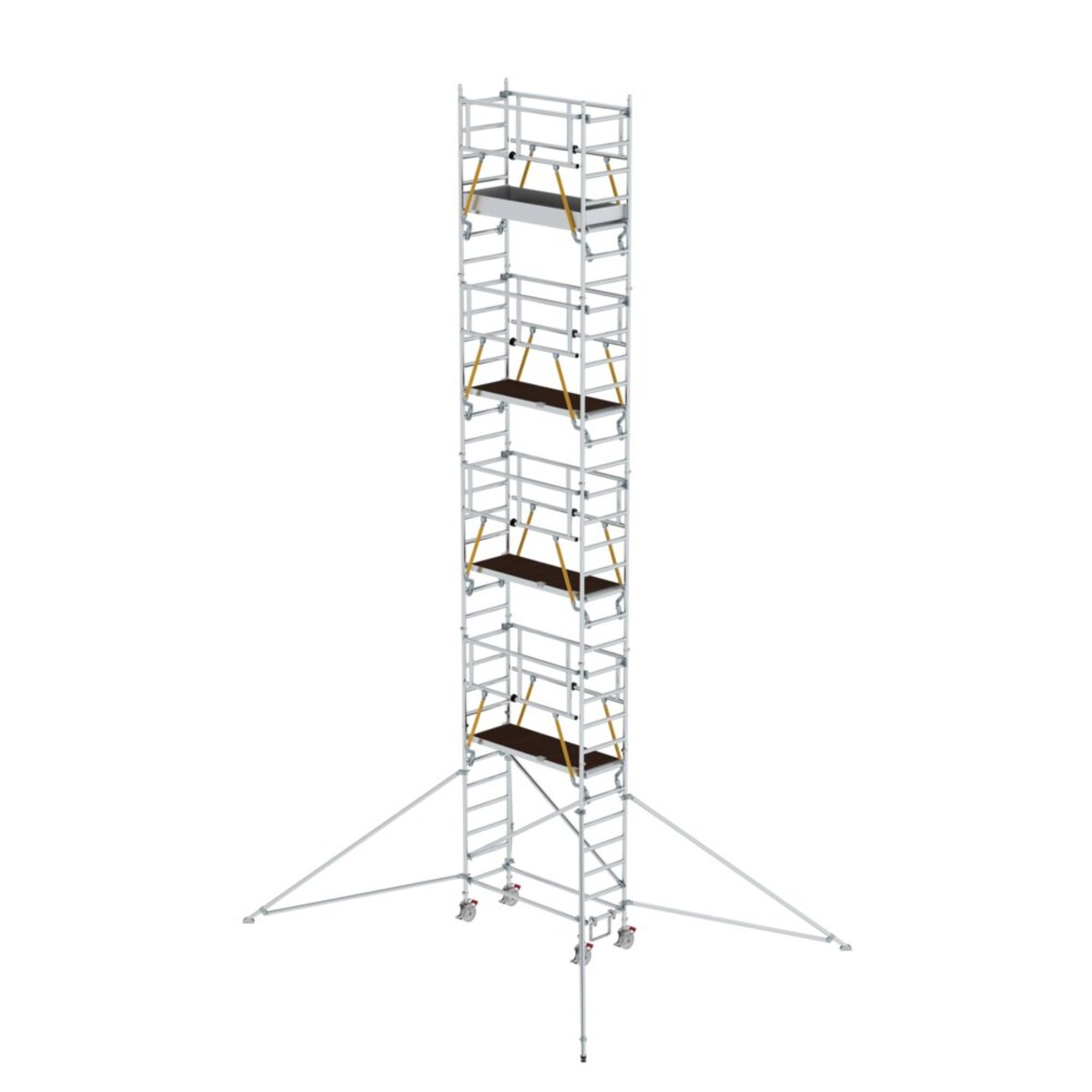 Rollgerüst aus stabilem Aluminium-Rundrohr mit geschweißten Rahmenteilen Dank vorlaufenden Geländern rundum gesichert, von Ebene zu Ebene auf- und abbaubar Alle Gerüstteile sind auch einzeln als Ersatz- oder Erweiterungsteile erhältlich Stabil und flexibel durch klappbare Ausleger Ideal auch für den wandseitigen Aufbau oder das Verfahren in engen Gängen Vier Lenkrollen Ø 200 mm mit zentrischer Lasteinleitung, Feststellern und Spindeln Aluminium-Bordbretter und Geländerrahmen mit integrierter Knieleiste zur Absturzsicherung Werkzeugloser Auf- und Abbau dank Steckverbindungen und Schnellverschlüssen Geringes Gewicht der Einzelteile für ein einfaches Handling Unterschiedliche Plattformlängen erhältlich (1,80 / 2,45 / 3,0 m) Arbeitshöhen bis 12,35 m GS-geprüft nach DIN EN 1004 Lastklasse/Gerüstgruppe 3: 2,0 kN/m²Informationen zu Nachhaltigkeitskriterien Unternehmenszertifizierung: ISO 90…